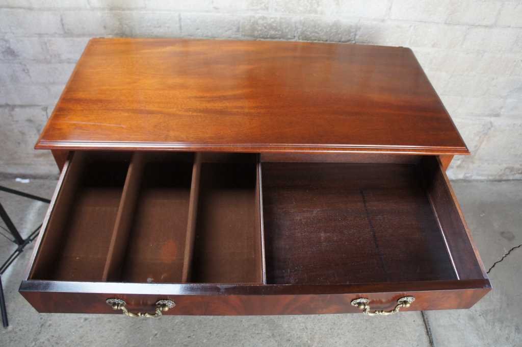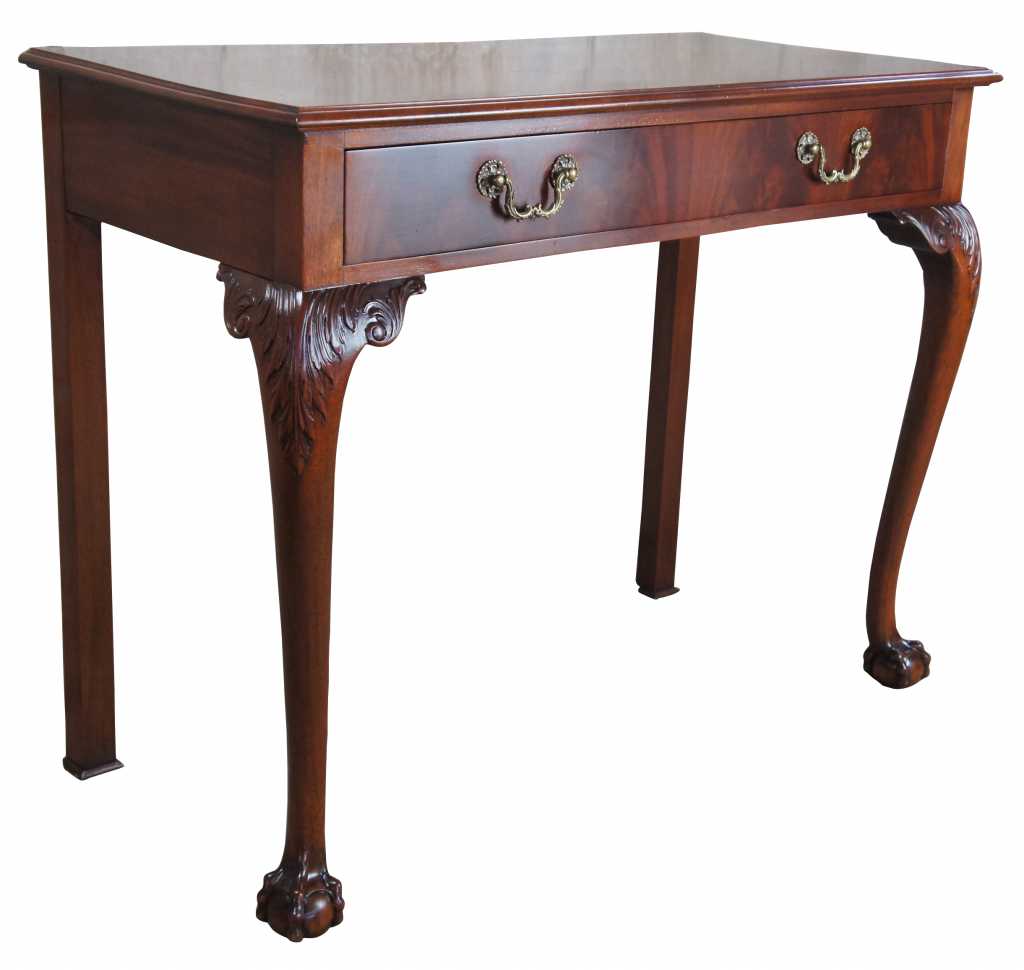 Quaint Chippendale style buffet. Features a flame mahogany central drawer with compartments for silverware, resting upon cabriole legs with intricate acanthus carvings leading to ball and claw feet.