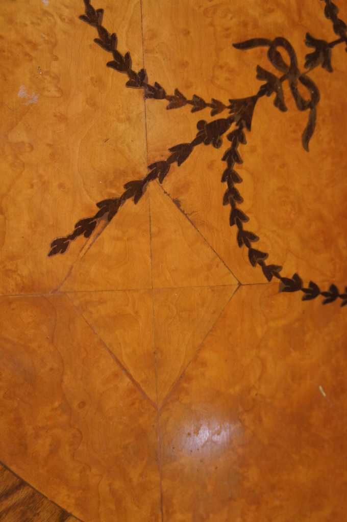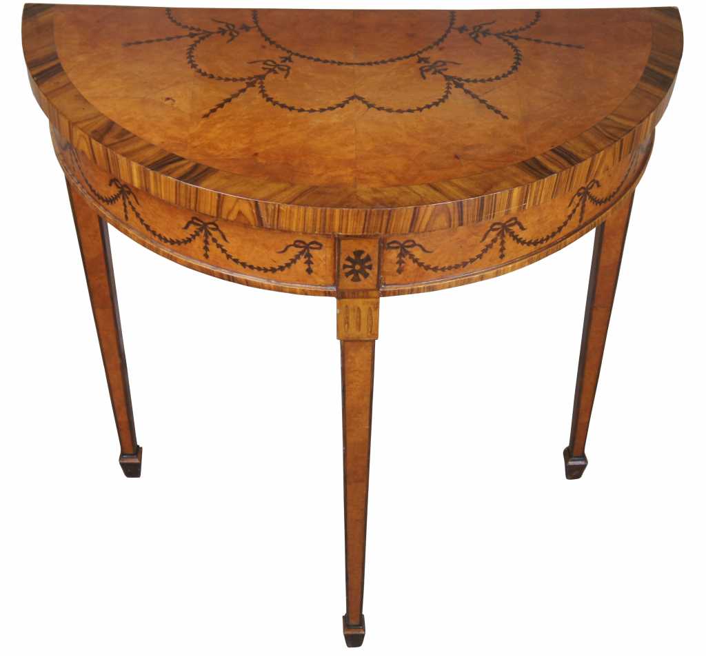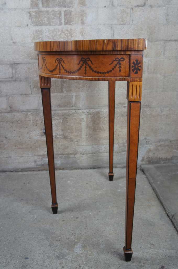 French inspired neoclassical console table with laural inlaid design and u banded edges. Features three long tapered legs with ebonized inlay leading to spade foot.