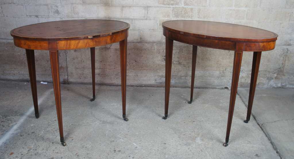 Early Baker Furniture oval side tables, circa 1940s. Made from flame mahogany with tooled leather tops. Features inlay and square tapered legs leading to castors. Drawing inspiration from Sheraton and Hepplewhite styling.