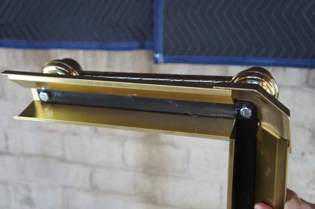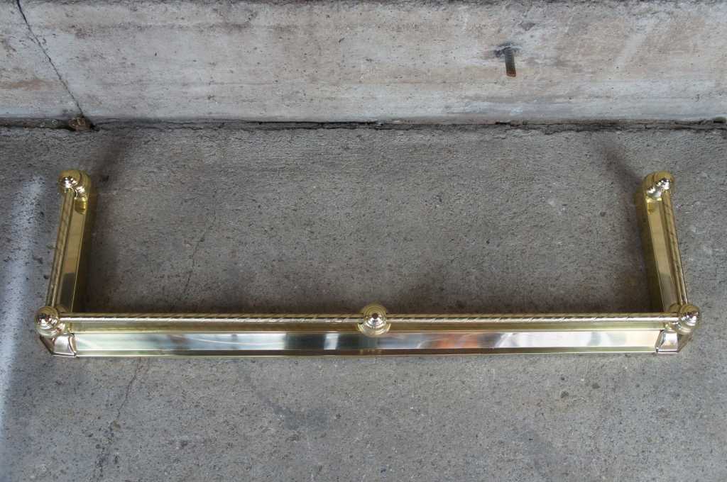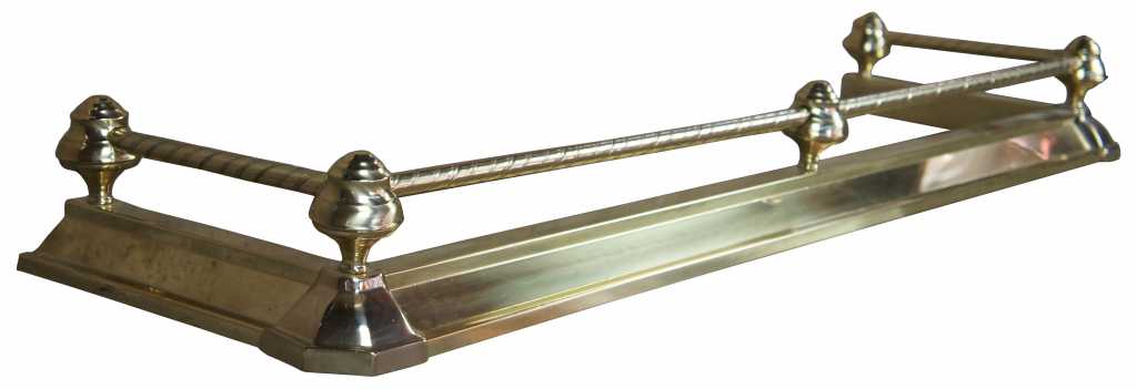 Victorian inspired fireplace fender. Features a streamline brass design with trophy finials interlocked by a turned rod.