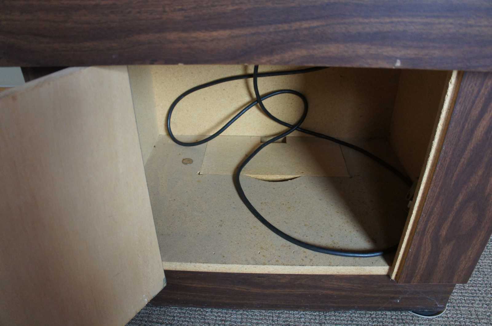 Good overall, not tested, no power. We were not able to get the machine to turn on, we believe there is a short in the power cord. No lock, machine very clean inside. Case has some wear and missing veneer. See pictures.