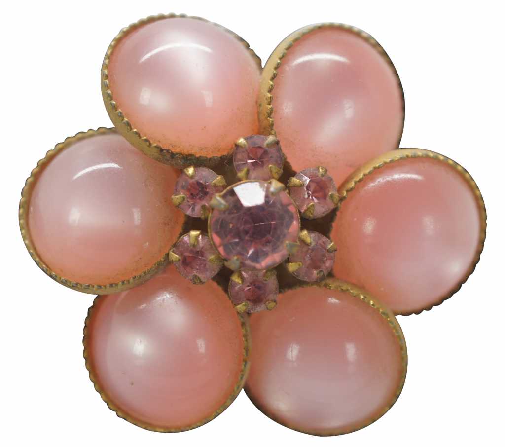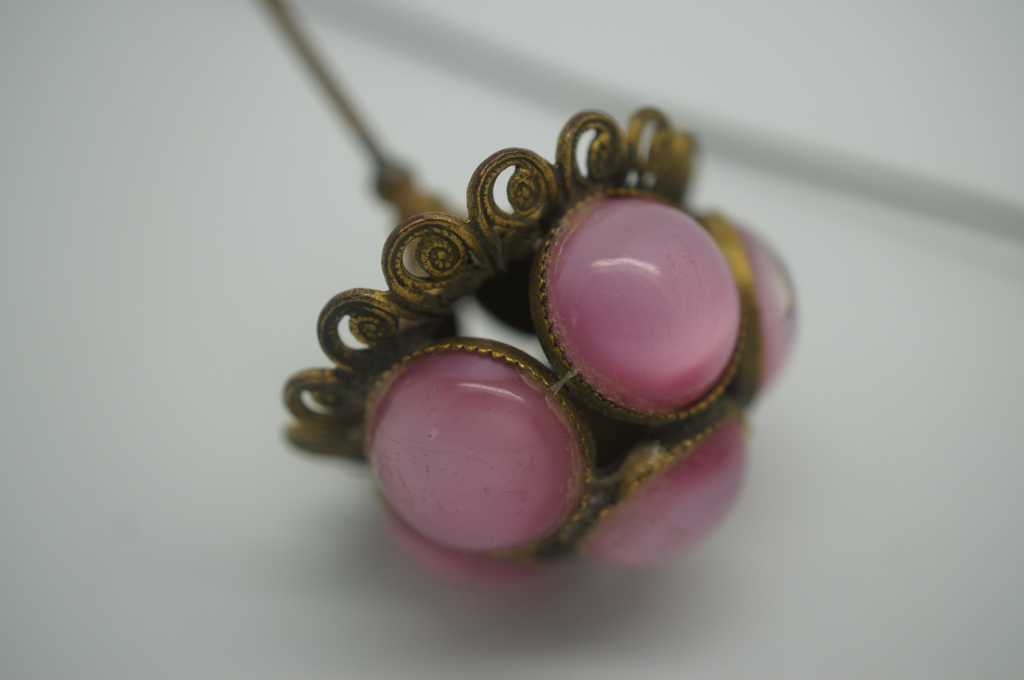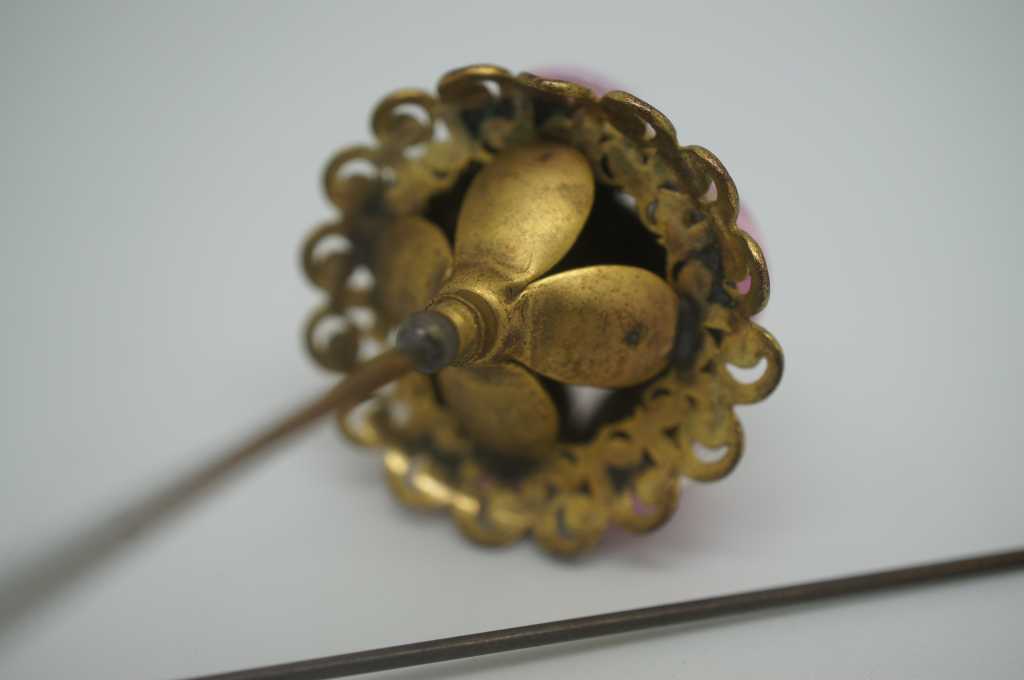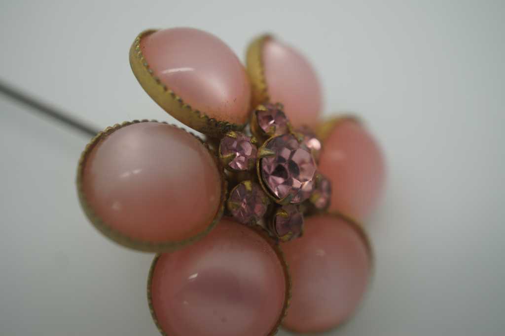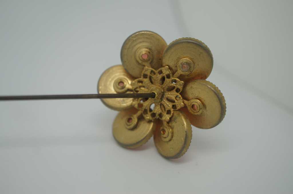 Two antique hat pins. Both feature floral clusters of rhinestones.