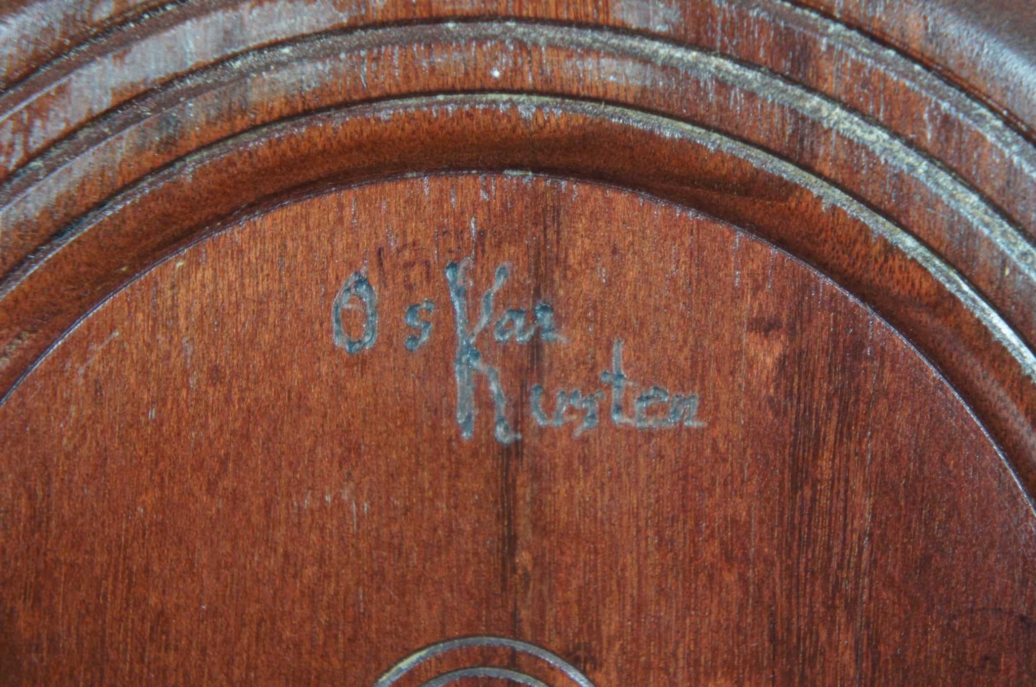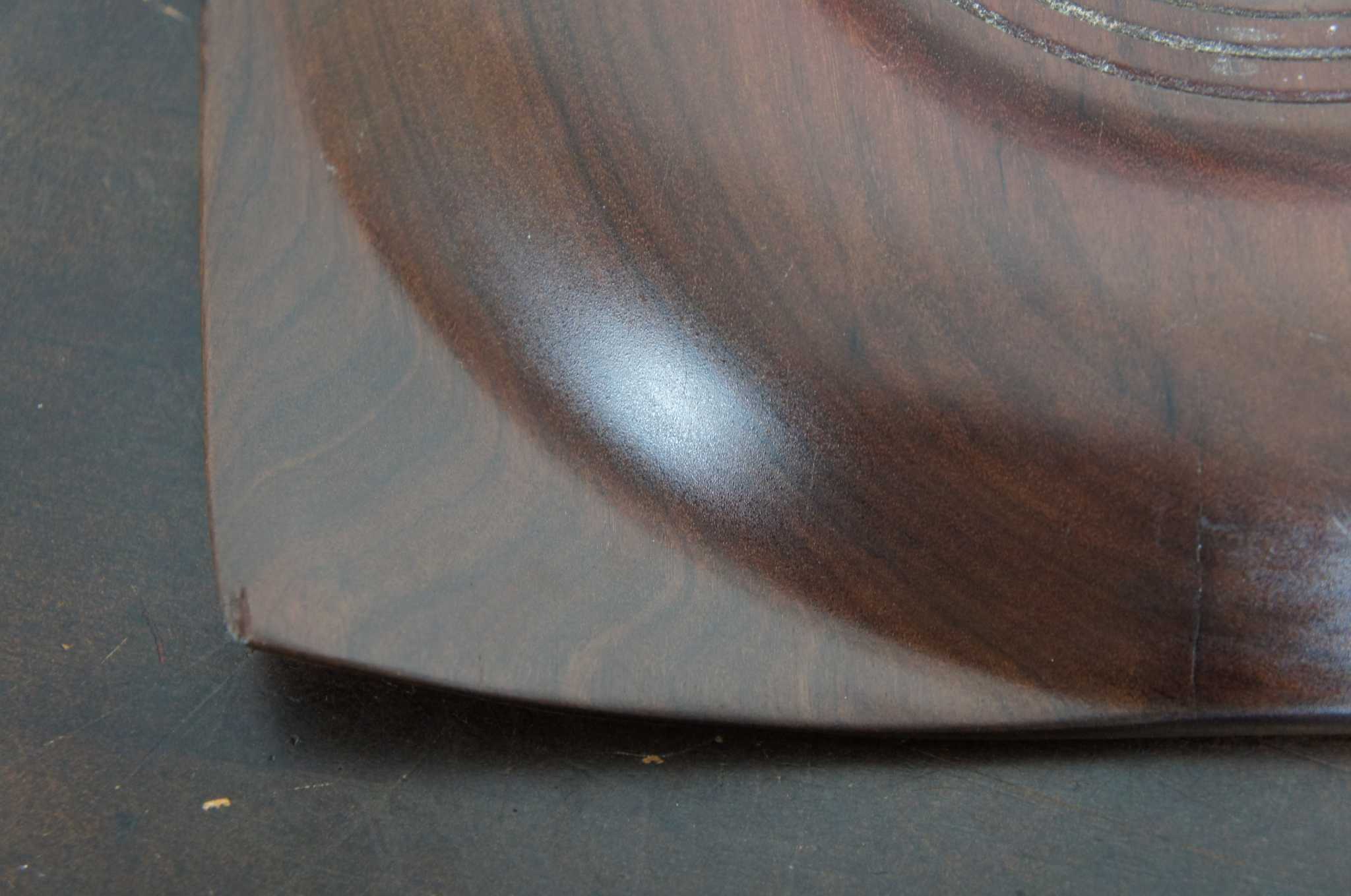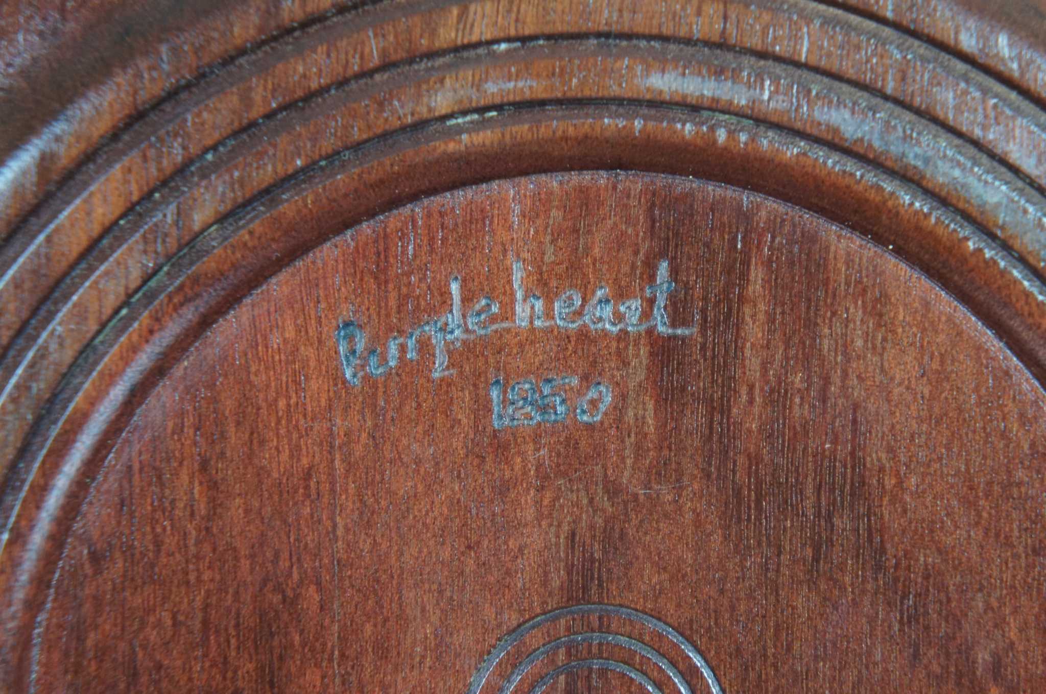 Mid century modern tray or plate by Oskar Kirsten. Made of Purpleheart wood, marked on back 1850 with signature. Oskar Kirsten is an award winning renown wood turner and retired Mechanical Engineer. He has a background in developing laser based instruments and is now retired. His life now includes enjoying time with his grandkids, enjoying his retirement, happily turning wood, playing flamenco guitar, and driving his finally restored 1960 190 SL Mercedes.