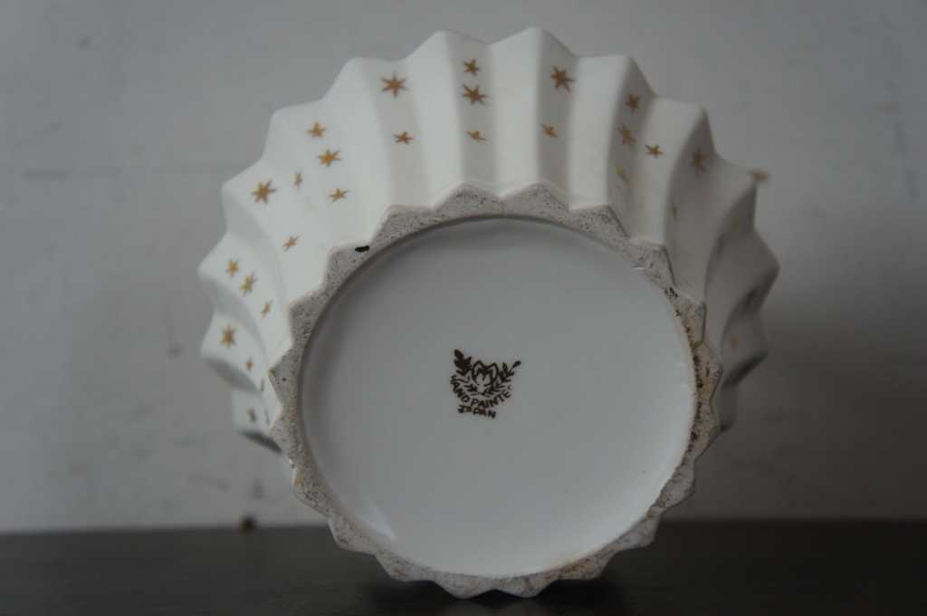 Hand painted Noritake Japan porcelain basket. Features a crinkle burst design edge and star motif.