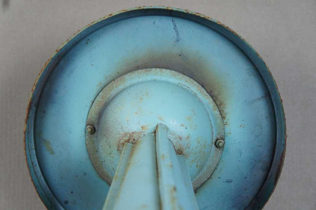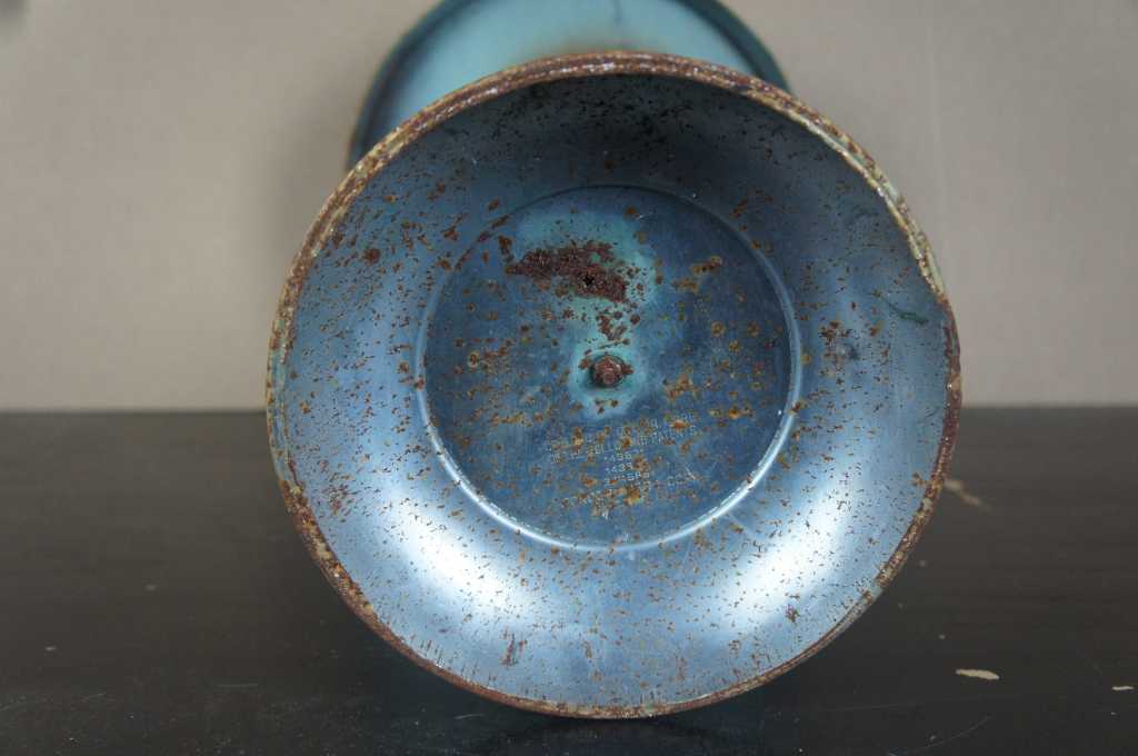 Vintage mid century metal smoking stand. Features a turquoise green color and art deco styling. A nice rusted patina , showing this beauty has stood the test of time. Finished with a handle for ease of use and ash catcher to conceal.
