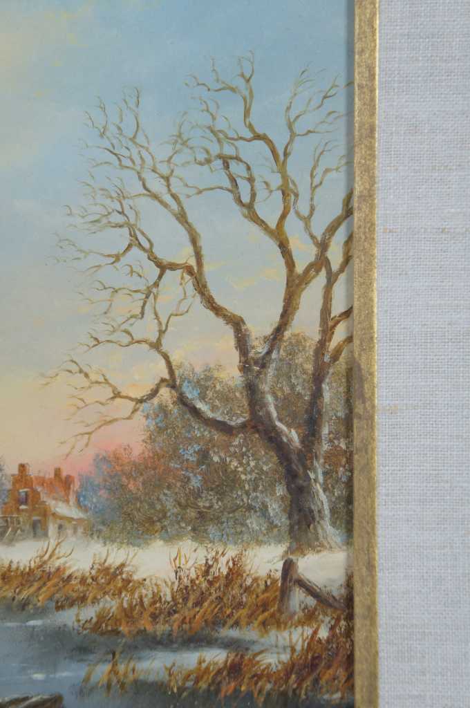 "Circa 1984 oil painting on board by Dennis Lewan, features ice skaters along the water in a small villiage. Two great bios about Mr. Lewan below: Bio 1: Dennis Patrick Lewan’s interest in art began at the age of five and drawing became one of this favorite activities. Never having much in the way of formal fine art classes, Dennis would find himself in trouble at school because of drawing instead of studying the regular subjects and also displayed a natural talent for music after taking some lessons on the accordion.