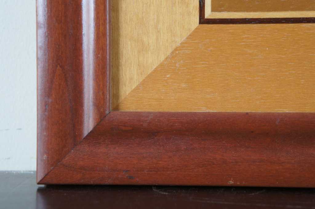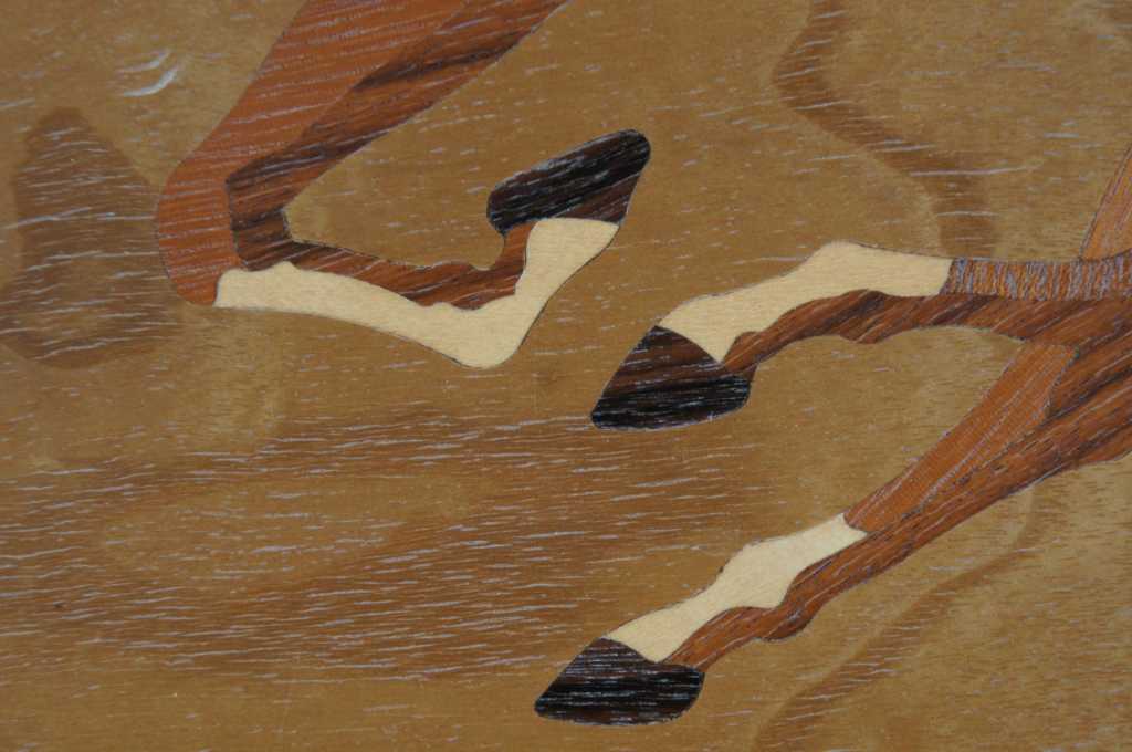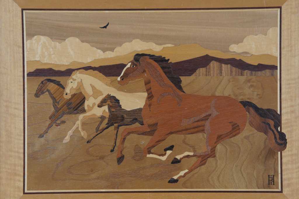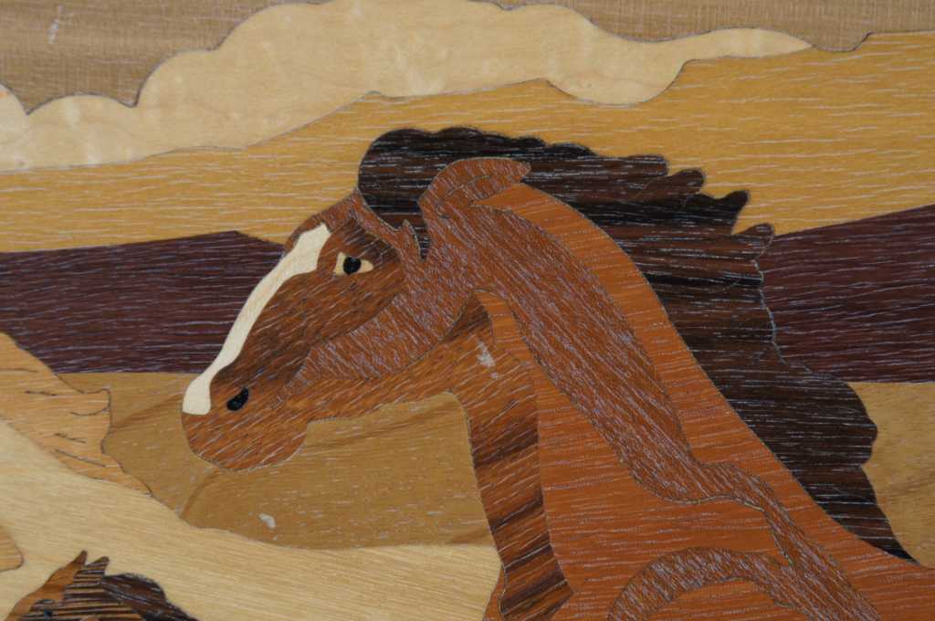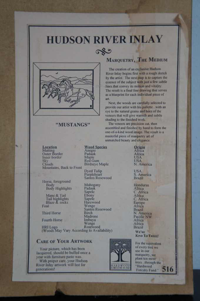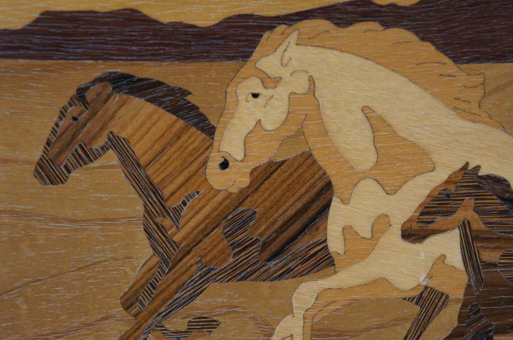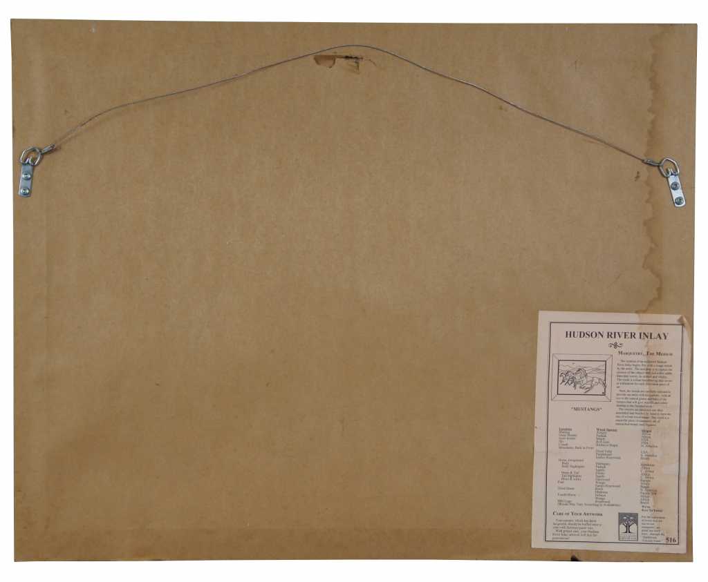 Marquetry Inlay Art by Hudson River Inlay. Titled Mustangs. Featuring exotic woods from Africa, USA, North American, Brazil, Honduras, C. Africa, Europe, and the Pacific Northwest.. Wood species used: Anegre, Paduak, Maple, Red Gum, Birdseye Maple, Dyed Tulip, Purpleheard, Santos Rosewood, Mahogany, Sapele, Ebony, Harewood, Wenge, Birch, Madrone, and Imbuya. On the backside of the art is a key showing which woods are used where, pretty neat! Style number 516.