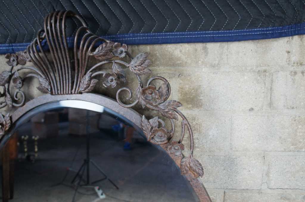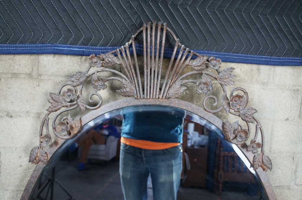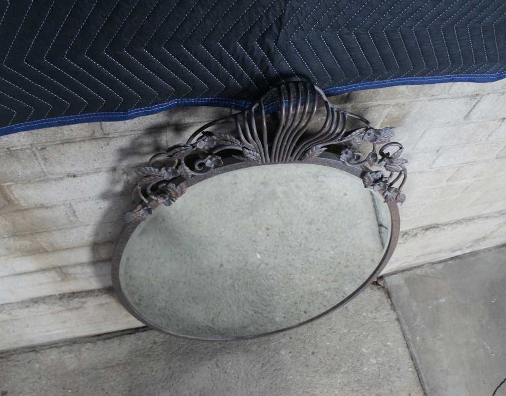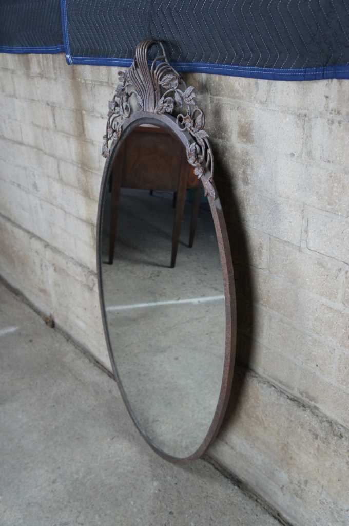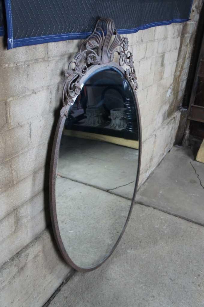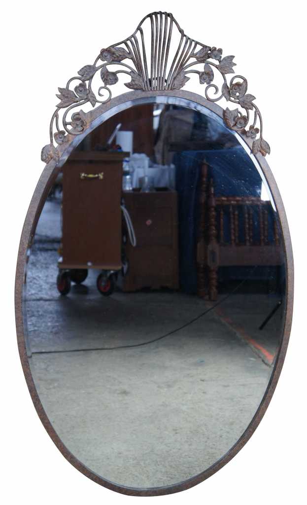 Large French inspired iron mirror. Features an oval shape, beveled glass and floral embellishment crown. Very heavy. Great for use in bathroom, entryway or above vanity.