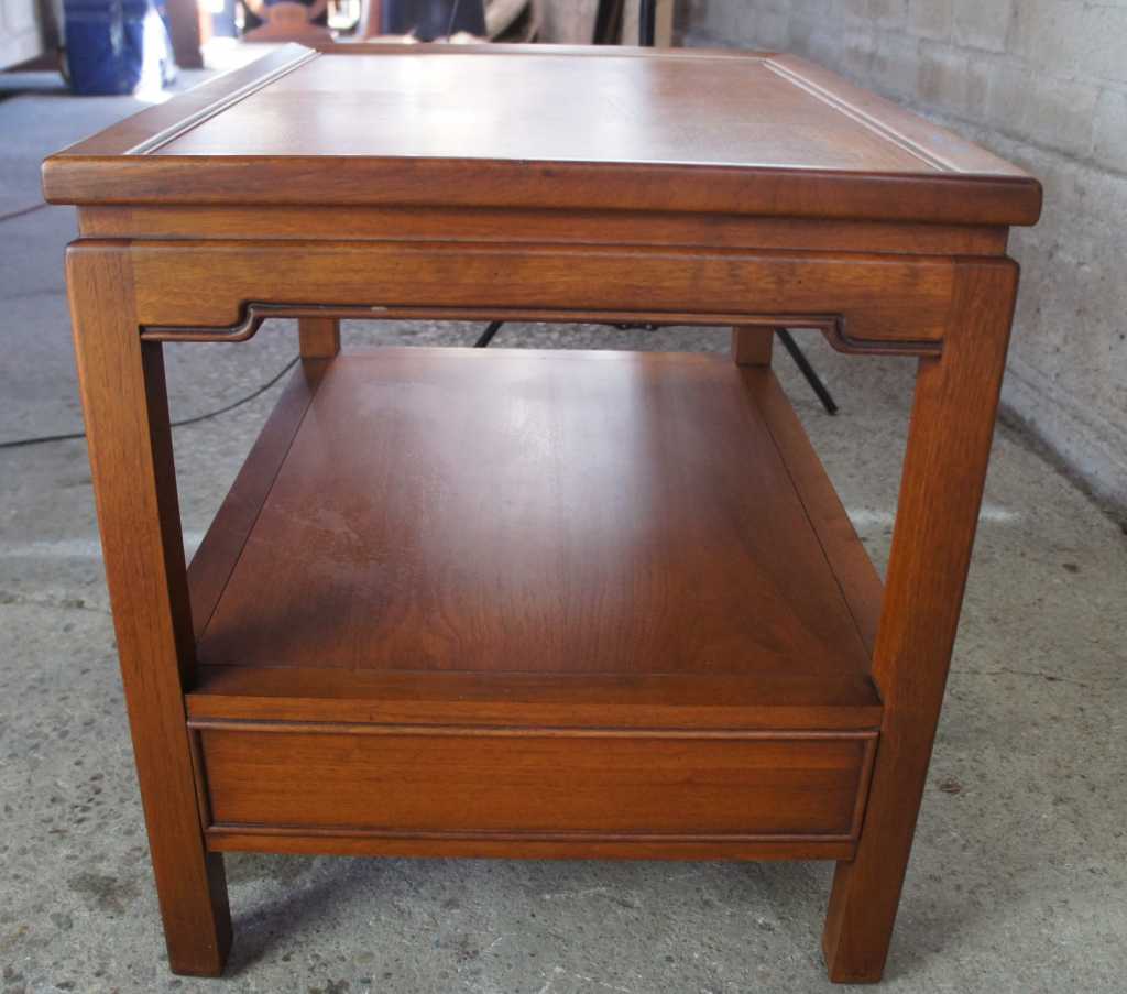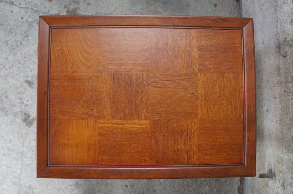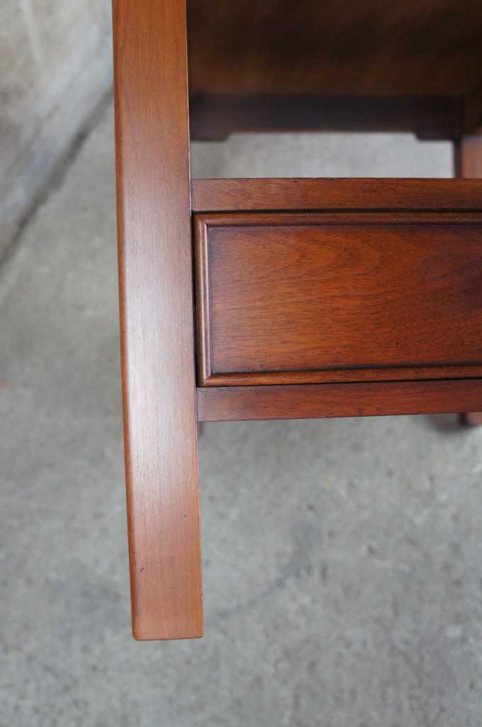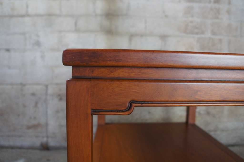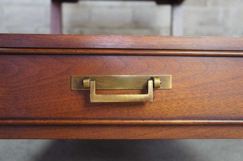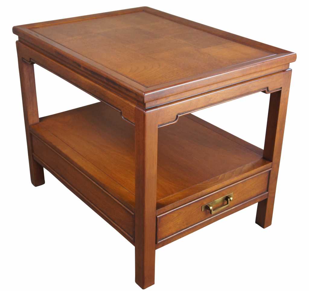 Late 20th century two tier checkerboard top table by Hekman. Mid century modern and asian styling with an inset checkerboard top. Includes long drawer with brass hardware.
