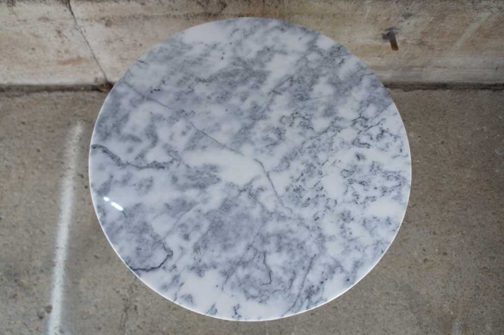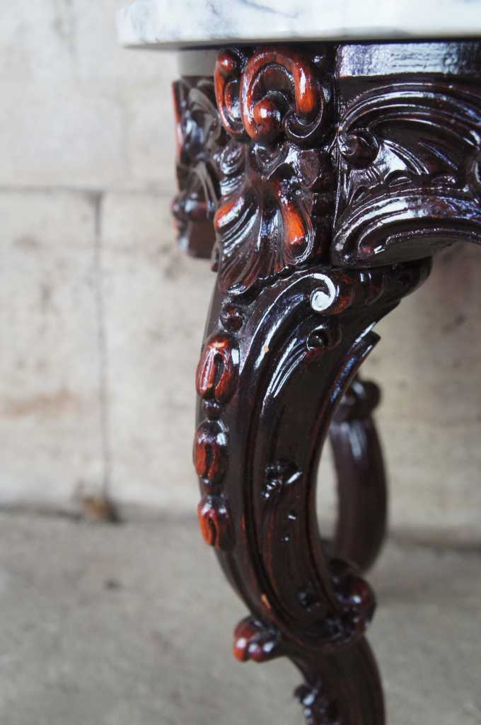 Late 20th century Italian Baroque carved side table. Features a dark tone finish with light red tone accents, white marble top, ornate scalloped and high relief design. A great reproduction for any victorian home.