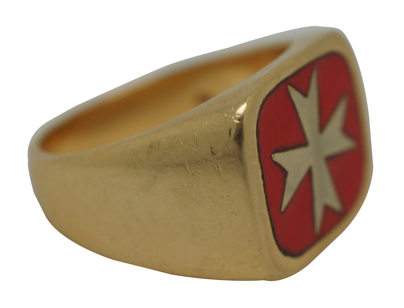 Vintage 14k gold Maltese Cross ring. Features red enamel setting with Maltese Cross. The Maltese cross is a cross symbol, consisting of four "V" or arrowhead shaped concave quadrilaterals converging at a central vertex at right angles, two tips pointing outward symmetrically. It is a heraldic cross variant which developed from earlier forms of eight-pointed crosses in the 16th century.