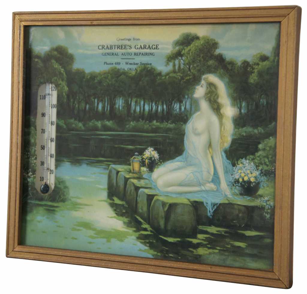 Vintage automotive advertising print in the style of Maxfield Parrish. Features a nude goddess nymph on the edge of the water. This was ordered by or made for Crabtree's Garage, General Auto Repairing in Oklahoma circa 1930s.