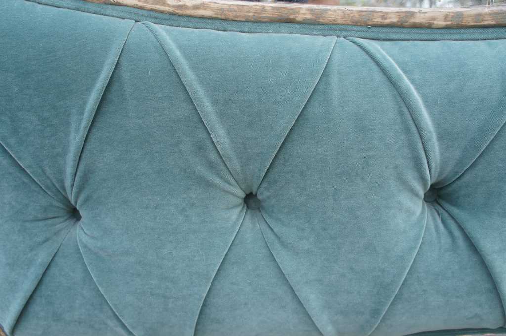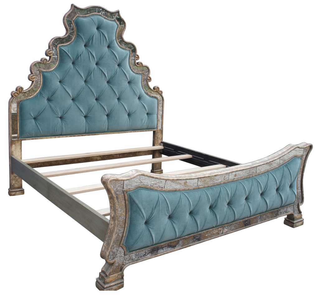 Monumental Venetian style Versailles king size bed frame. Features antiqued and distressed mirrored frame with teal green tufted velvet.