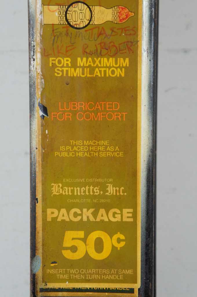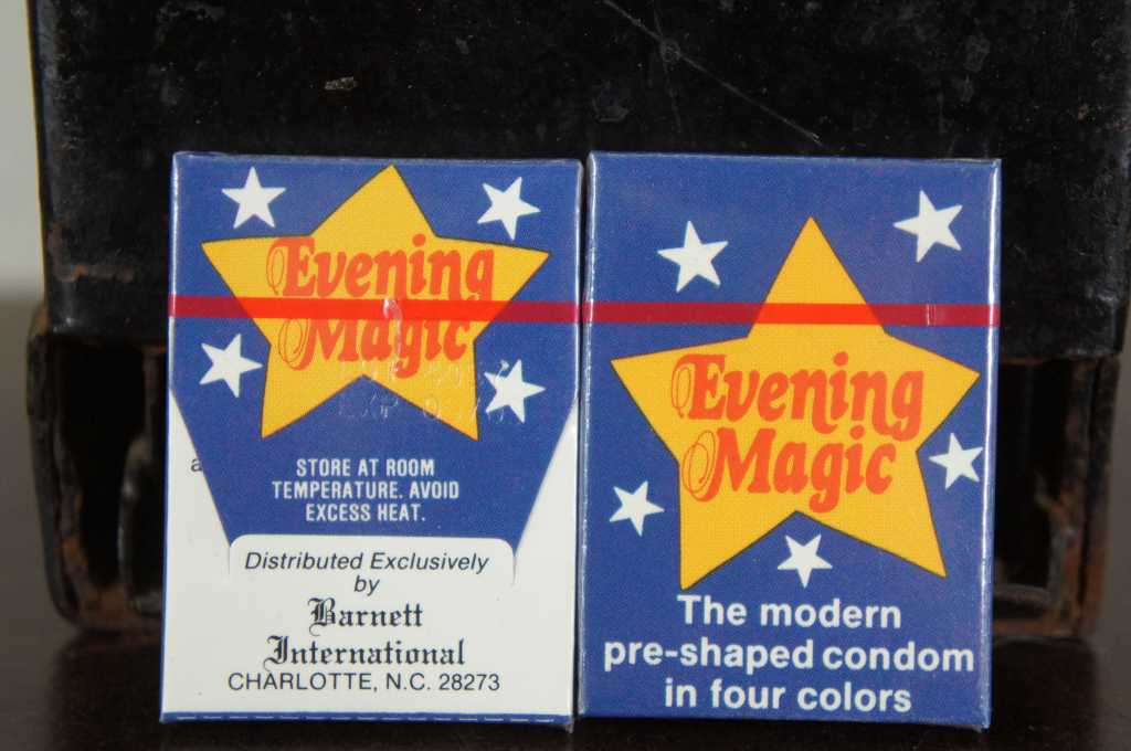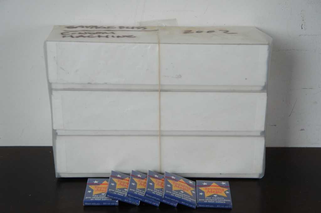 Savage Bliss condom machine and extra Evening Magic condoms (expired, unopened). Machine label has vulgar graffiti writing scribbled on it.