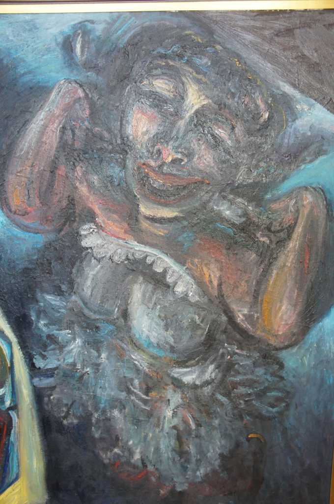 A massive oil painting with a surreal three dimensional vibe. Features a floating woman within the Church near the alter light with stained glass surrounding. Signed lower right, Keesee 1985.