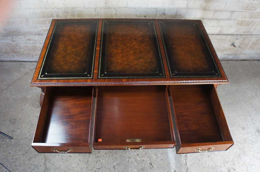 Chippendale style library or office desk by Maitland Smith. Made from mahogany with intricatley carved details including high relief acanthus legs leading to ball and claw feet. Features a three panel brown and gold tooled leather top with carved scalloped apron and three long drawers. Drawers are banded with brass pulls and neatly framed by ornate trim. Finished on both sides like a partners desk, but with false drawers on front, leaving full length drawers for use.