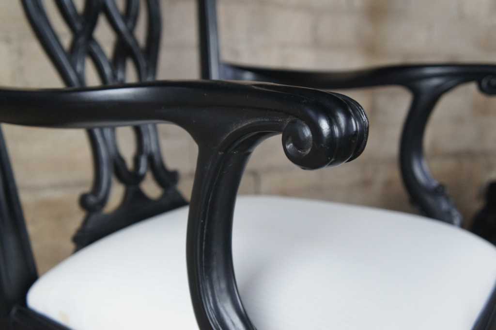 Pair of vintage mahogany chippendale style arm chairs. Features a black painted frame and white striped seat cushion.