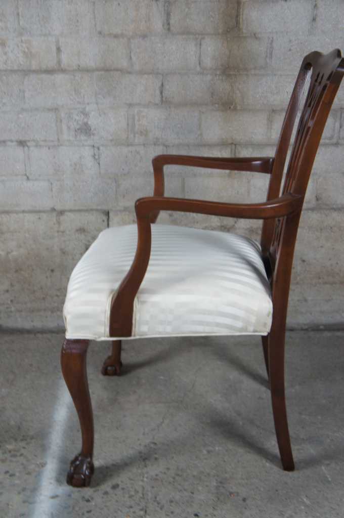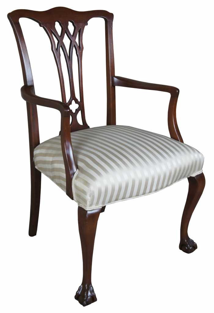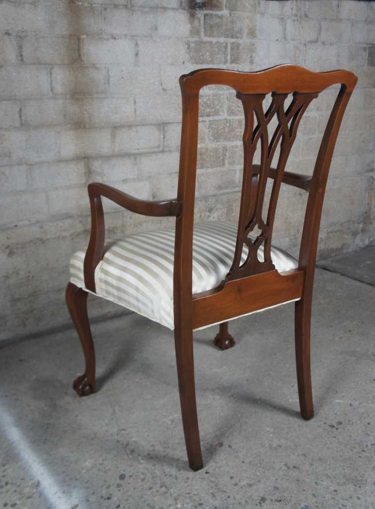 Beautiful antique chippendale style mahogany arm chair. Features dark wood and striped cushion.