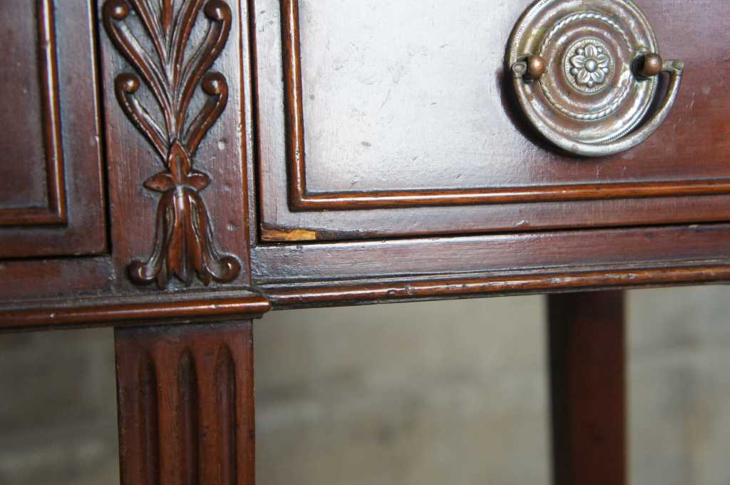 The perfect sized table for any narrow space. Sheraton style with a breakfront top. Made from mahogany with three oak drawers over tapered and fluted legs terminating to block feet.