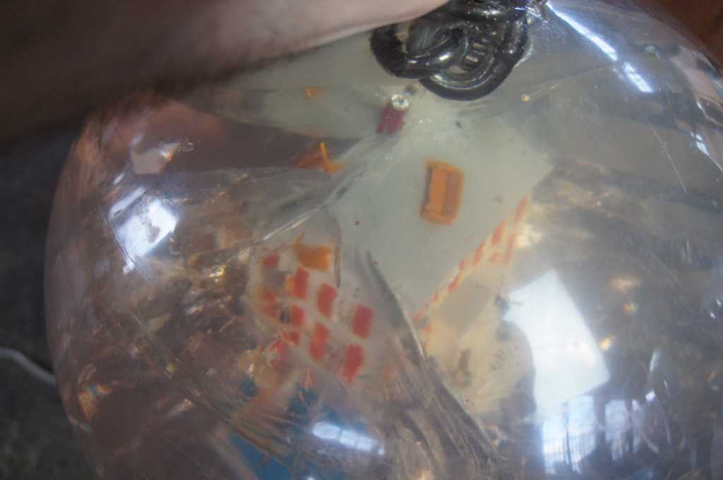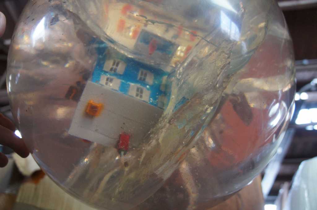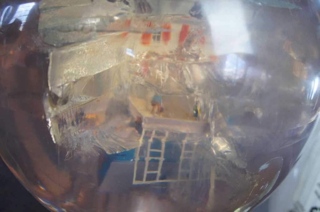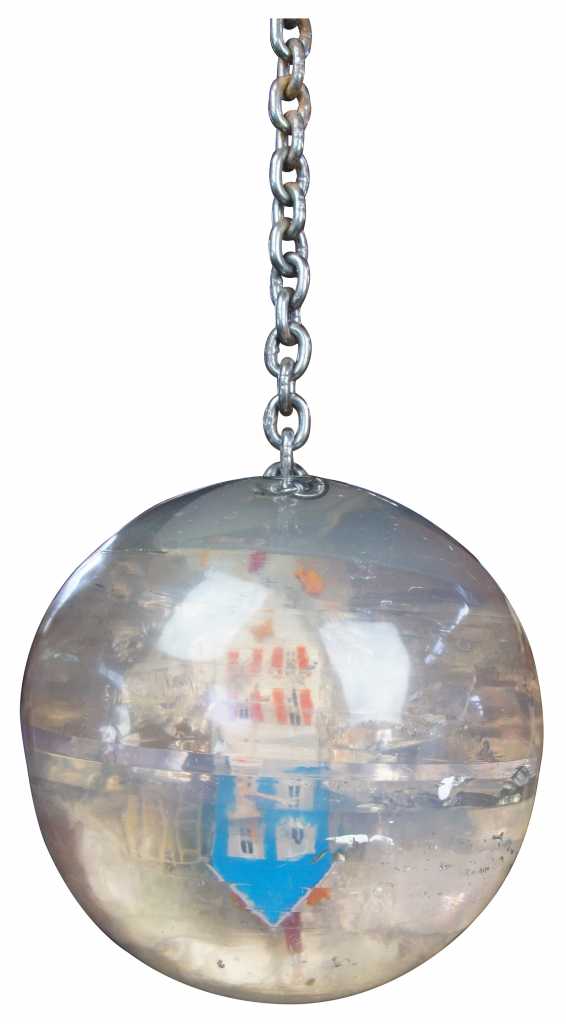 Carter was born in Canada in 1962. In the early 1990s, Carter began exhibiting his art sculptures in galleries. The Wrecking Ball was one of his early installations and features a polyester resin ball with miniature dimensional fiber homes colliding on the interior. Furniture and people can be seen spattered about. The demolition ball is connected to a heavy 9' steel chain that anchors to a ceiling with a cast iron support.