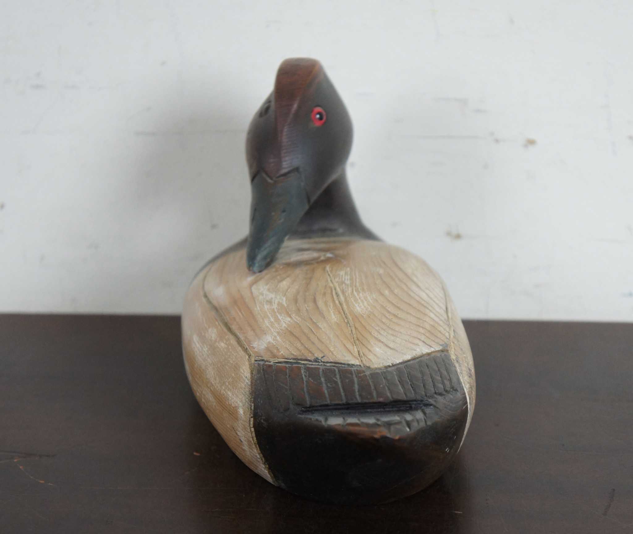 Hand carved duck decoy by Richard and Blanche Neff. Features a Canvasback duck carved from white cedar, 1983. Richard was from Greenville Ohio and died in 2013. He was a lifelong wood carver and owner operator of Neffs Woodcrafts in Archanum.