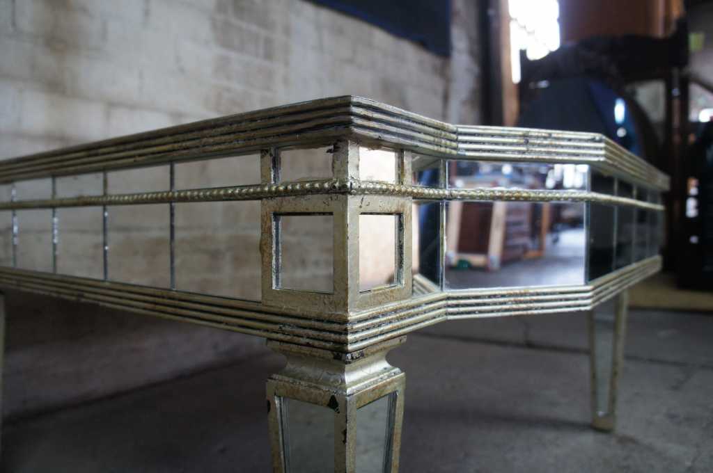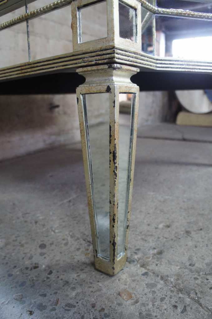 A mirrored coffee table with beveled glass top in Venetian styling. Features a silver distressed finish, beaded trim and reeded table apron.