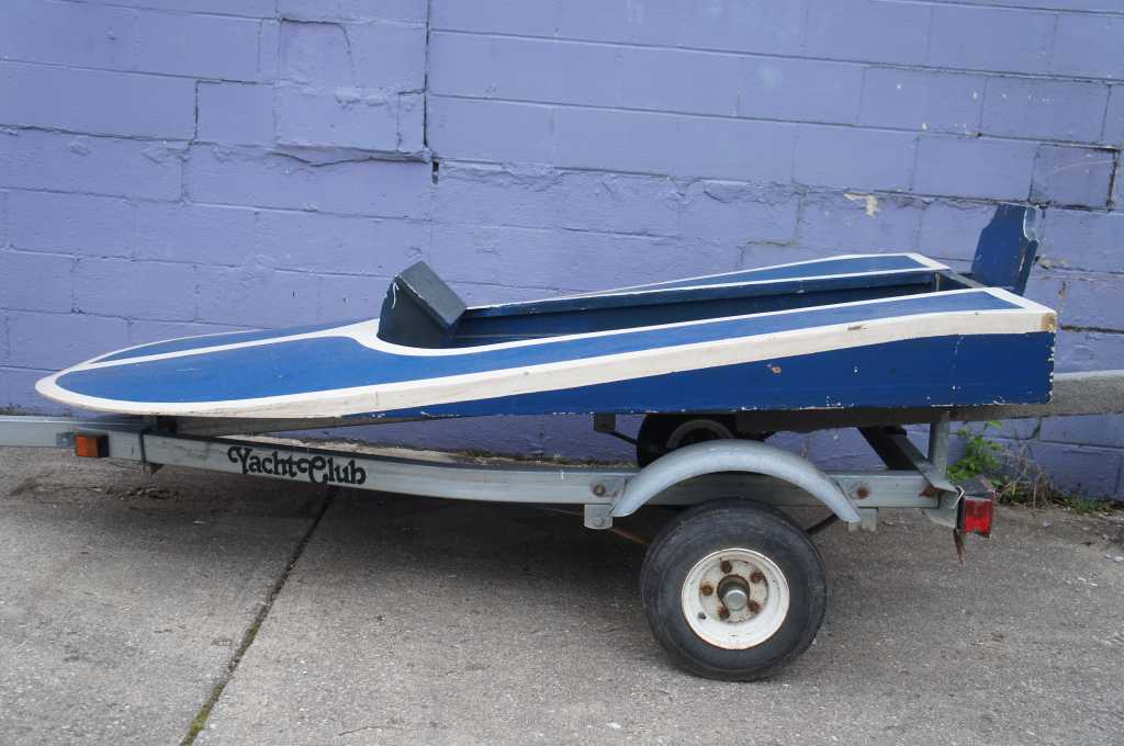 Vintage 1950s Thunder boat or Hydroplane. These boats were the early wave runners. This one appears to have never made it in the water. No steering or engine. Trailer available at additional cost.