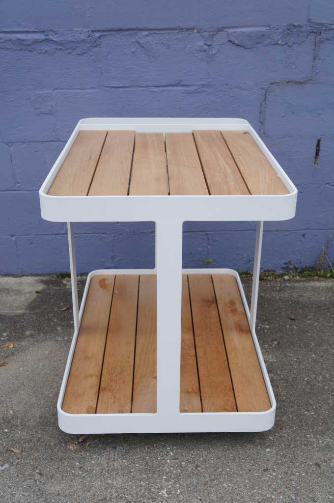 Frontgate Baguta bar cart, features sleek teak, slatted and framed by durable matte-powder-coated aluminum. Yielding the perfect space for both mixing and raising spirits.