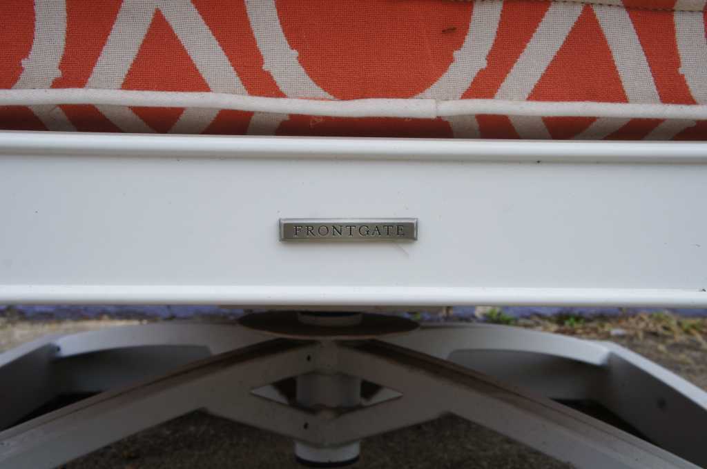 White aluminum frame with peach geometric modern style upholstery. Inspired by neoclassical interiors, the Glen Isle White Swivel Lounge Chair features an extraordinary level of detail that is rarely, if ever found in outdoor furniture collection. The aluminum frame is expertly double-cast in molds that are handcarved by master artisans. The crisp white powdercoated finish is hand-applied in multiple steps. Comfortable, notched cushions are encased in premium 100% solution-dyed fabrics.