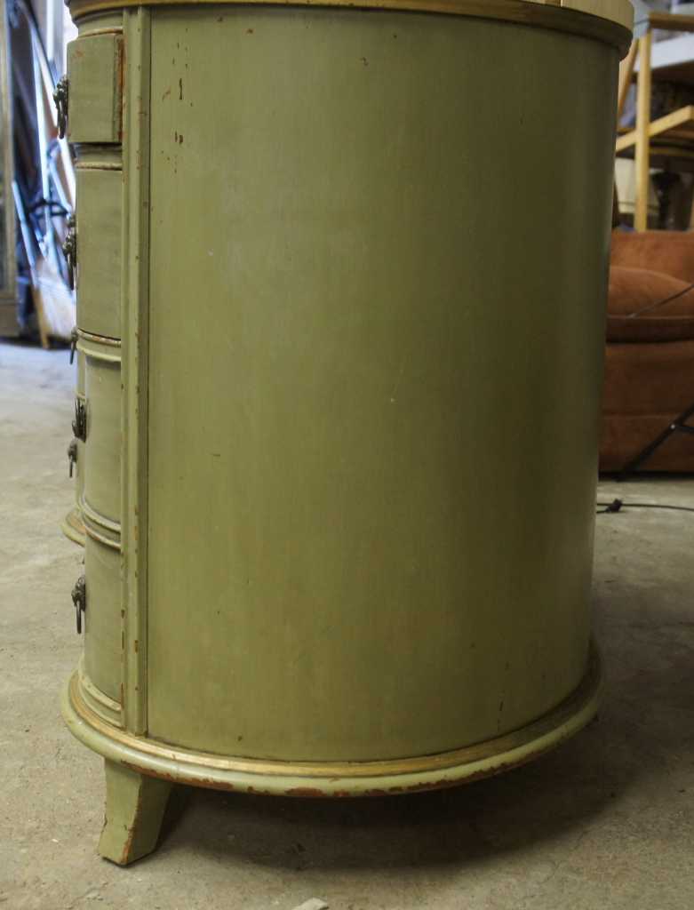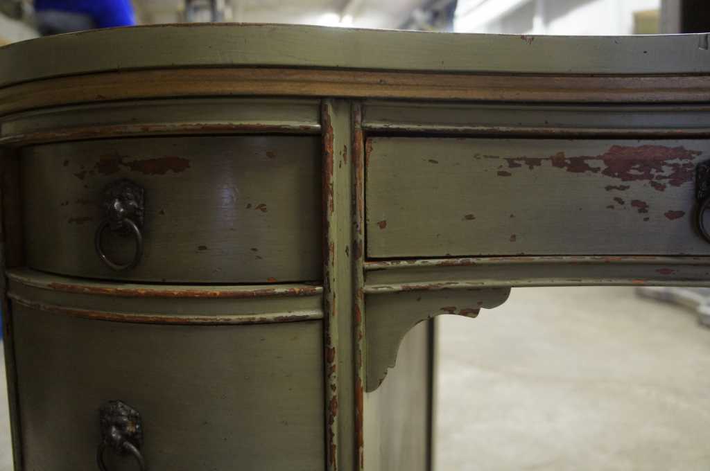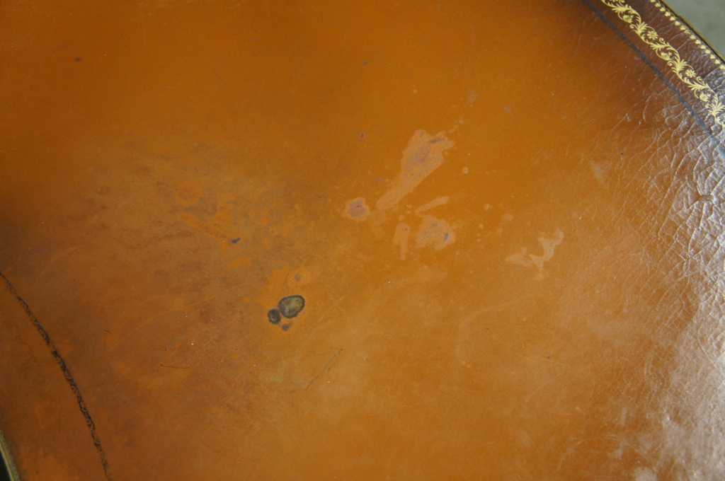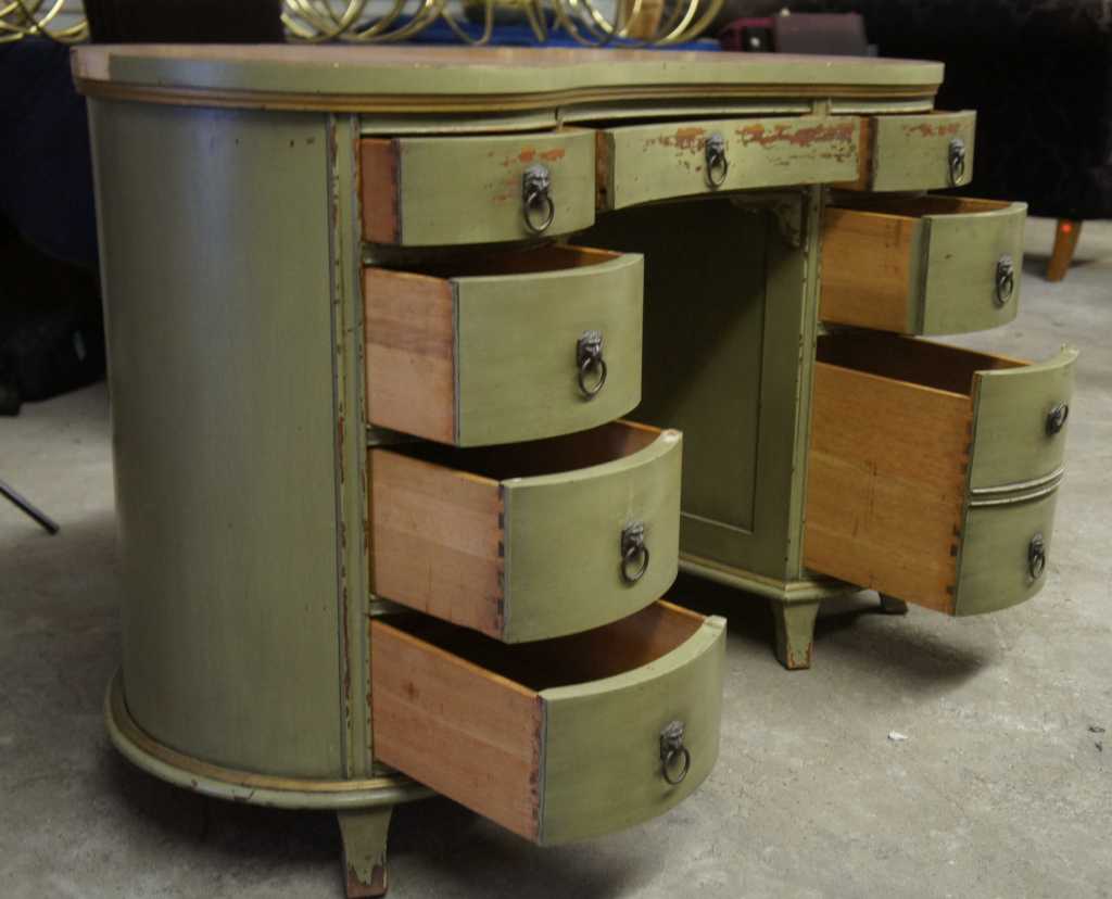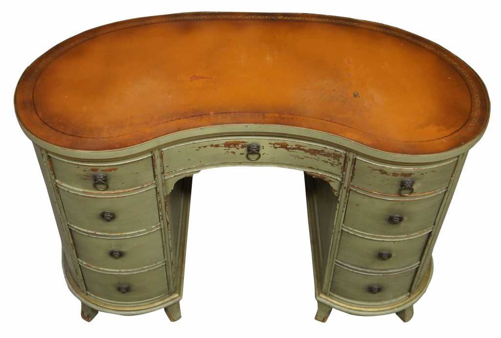 Mid 20th century painted mahogany kidney bean desk. Features brown tooled leather top, lion head knocker accents and distressed painted finish.