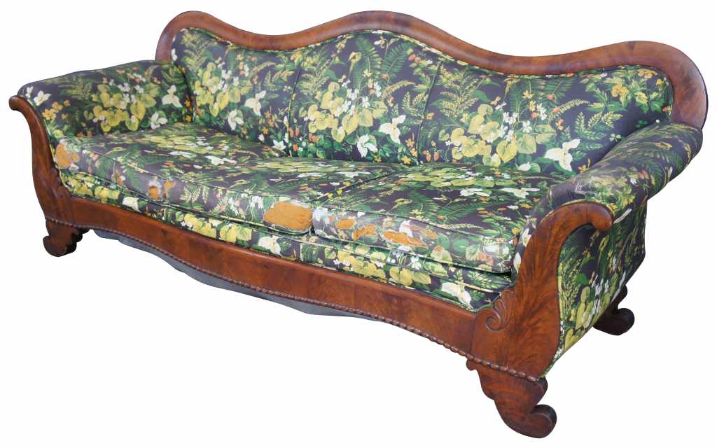 Circa 1850s American Empire camelback sofa. Made from flamed mahogany with flared arms and beaded lower apron. Upholstered in a green and black jungle theme fabric that needs to be replaced.