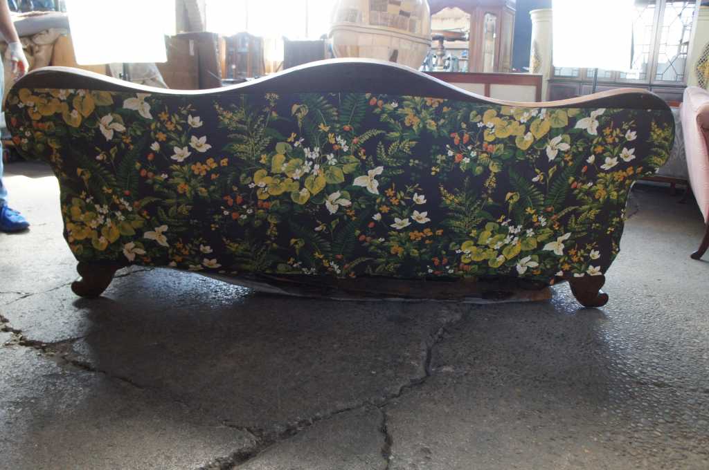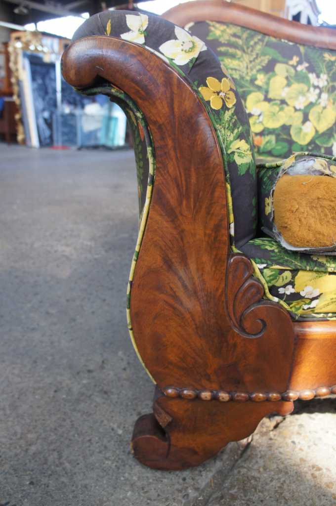 Good structurally and aesthetically, Upholstery worn / torn and needs to be replaced. Hand tied springs are loose and need to be rebacked and supported. Front right leg repaired in past.