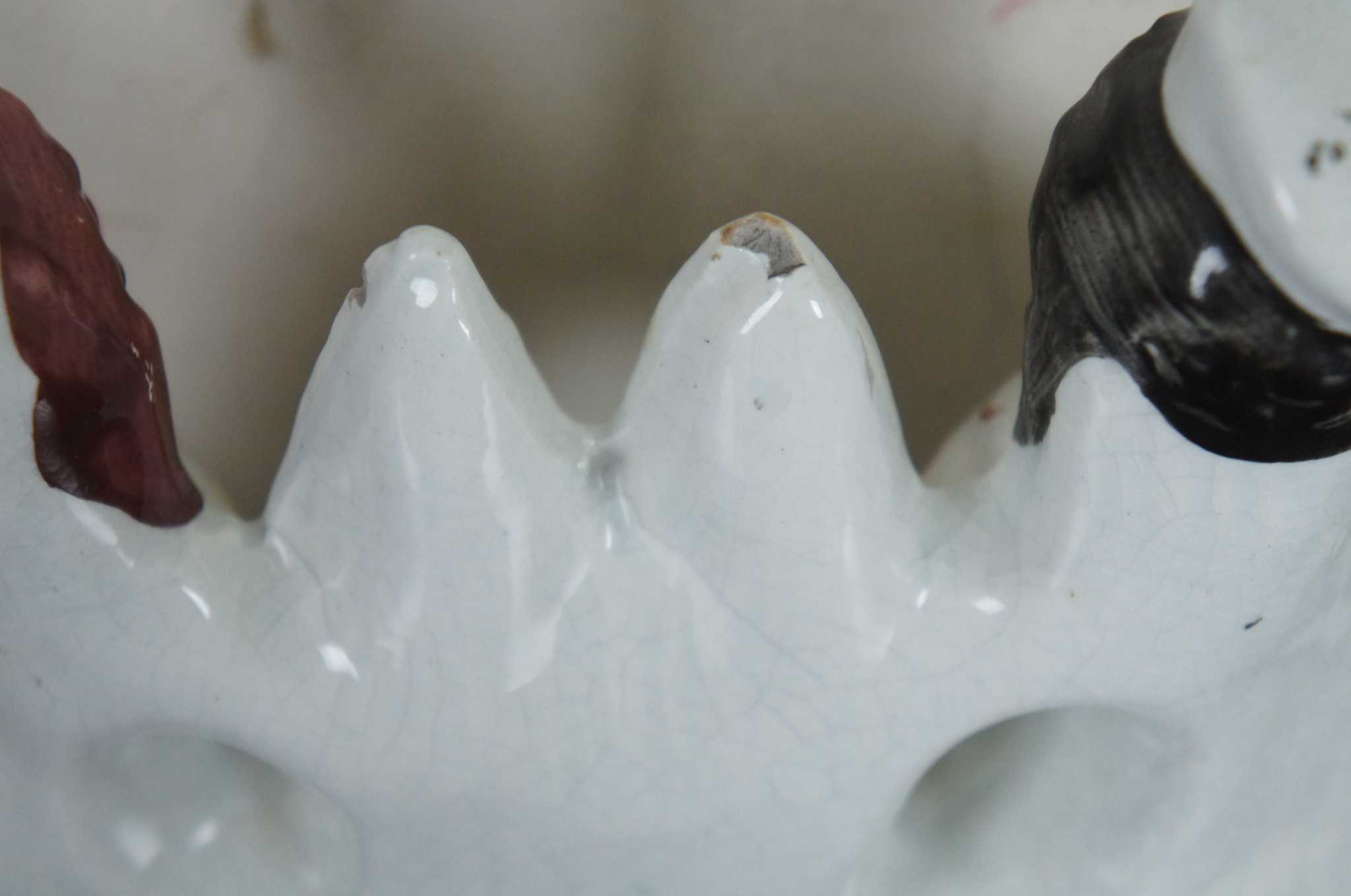 Antique Staffordshire Pottery figurine. Features a Scottish couple, man and woman, in traditional attire. The man wears a kilt and the lady a dress. Nice vibrant detail and colour throughout.