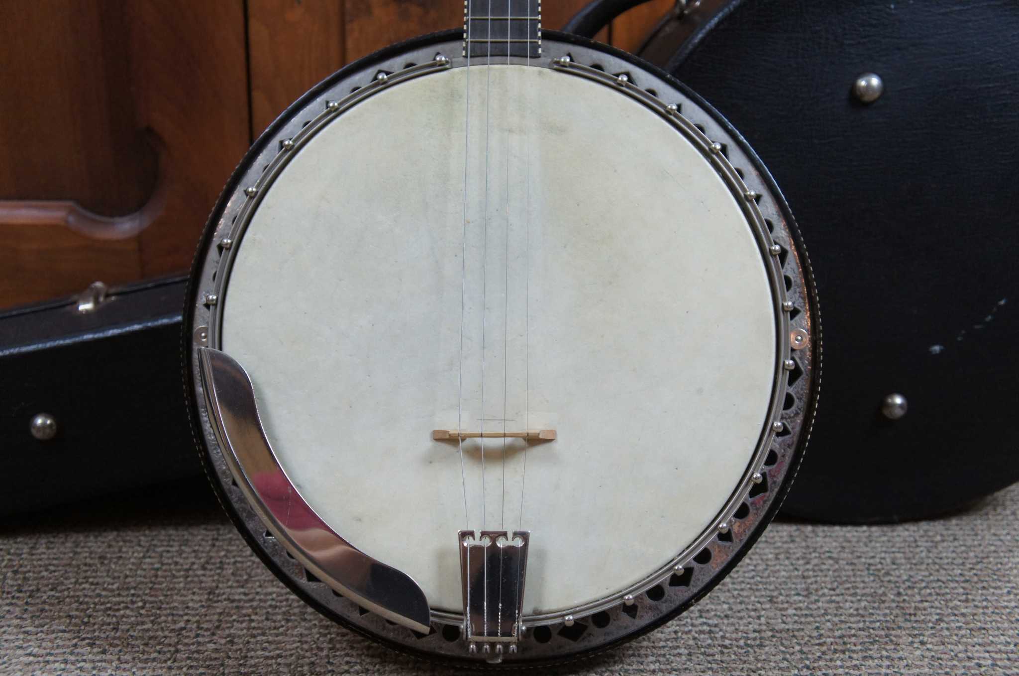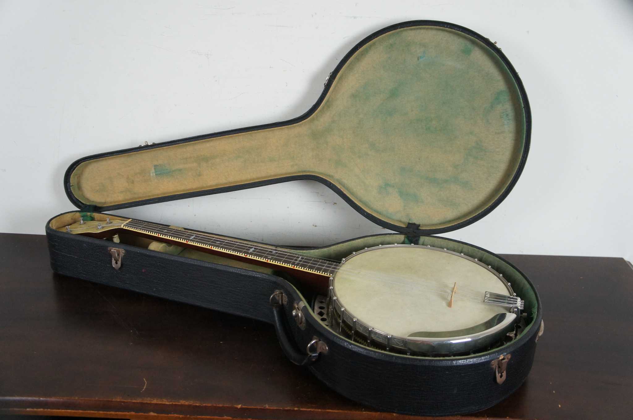 1930s Kay Kraft resonator tenor banjo & case. Made from maple with mother of pearl and marquetry inlay and ornate gold accents of baroque florals, trumpets and figural faces.