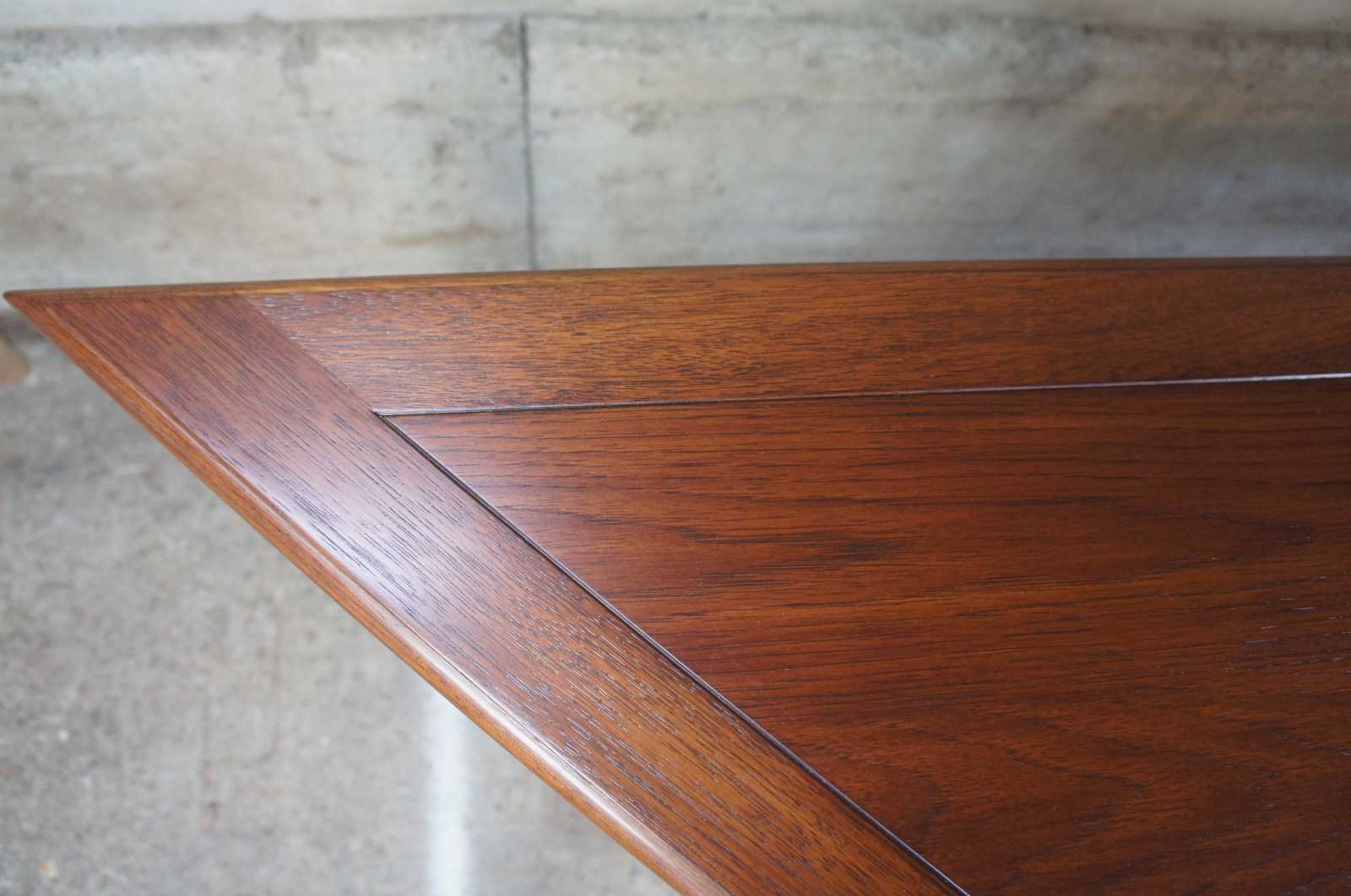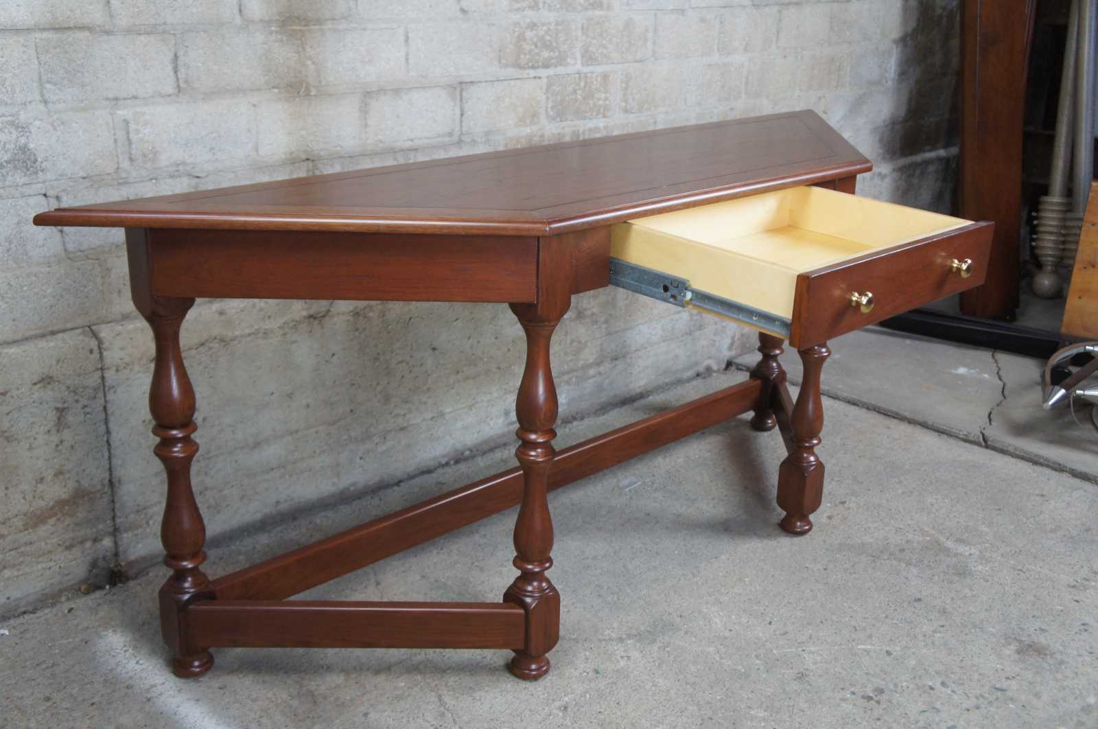 Solid oak early American style console table featuring turned legs and unique trapazoid angle shape. This piece was custom made by Wampler and Sons of Bellebrooke Ohio in the 1980s.