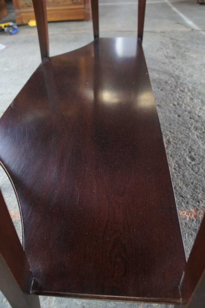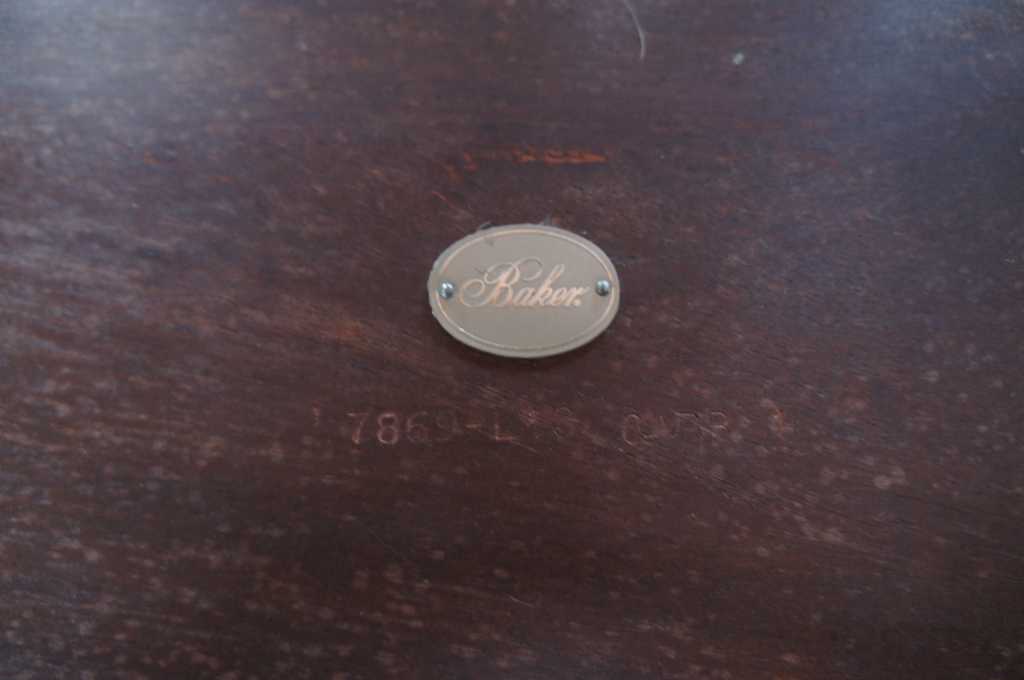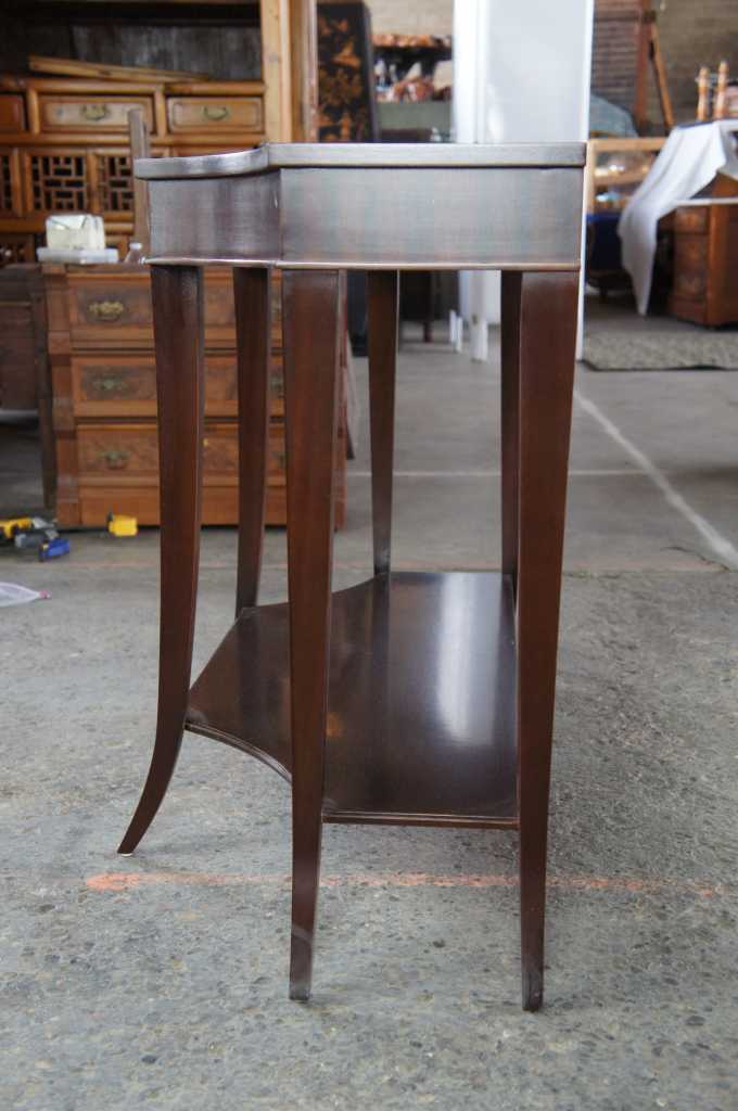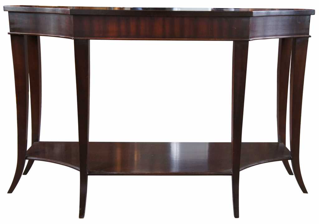 Barbara Barry for Baker Furniture console table. Features a breakfront shape, lower shelf and long tapered saber legs. Made from mahogany in a dark finish.
