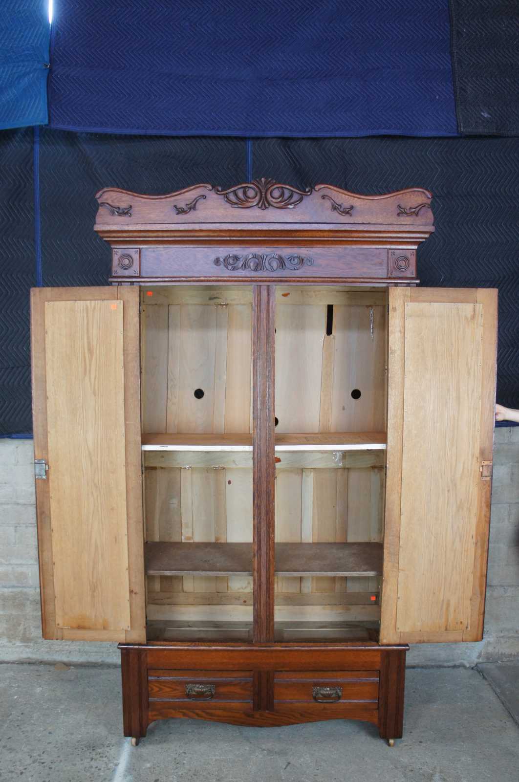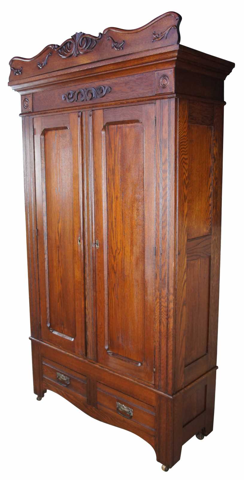 Antique Victorian oak knockdown armoire or wardrobe. Late 19th century, carved and scrolled accents and pronounced crown with rounded corner medallions. Features three shelves and two drawers, with functional lock and key.