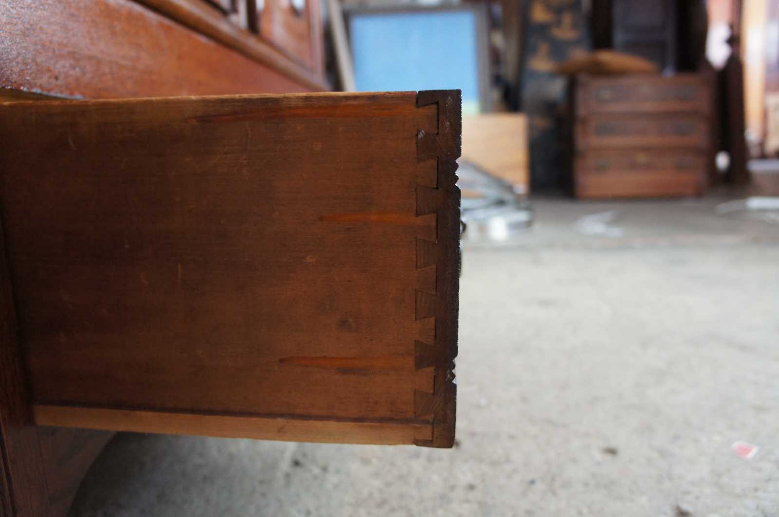 Good overall, use related wear, backing shows glue reside from being moved and repaired in the past, shelves not original.