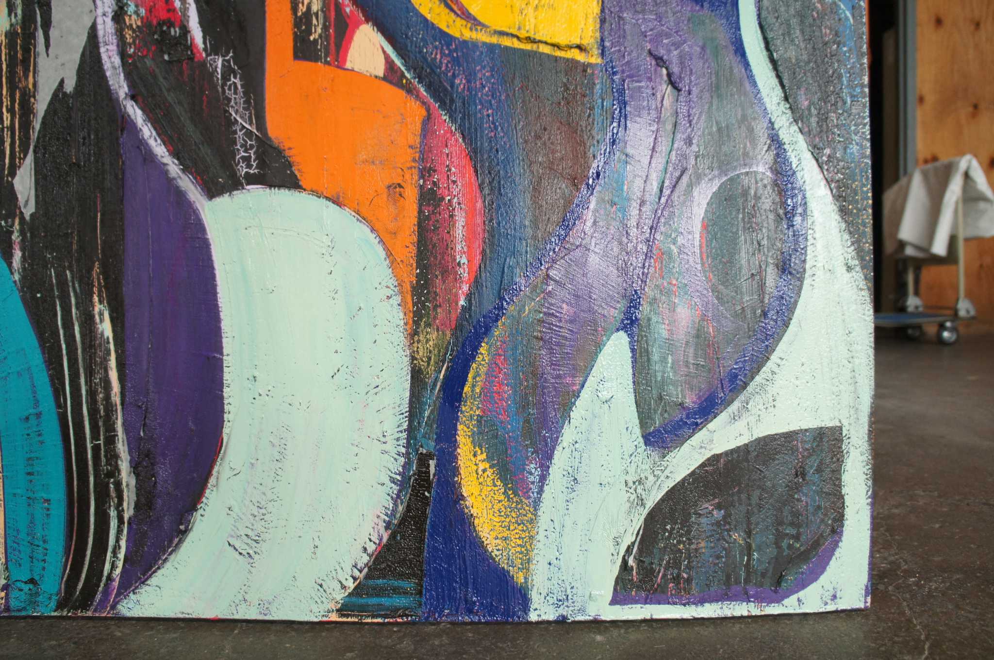 Large abstract modern expressionist painting by Jason Fascination. Painted in acrylic with a colorful mixture of vibrant shades. Canvas mounted to wood frame, painted on sides.