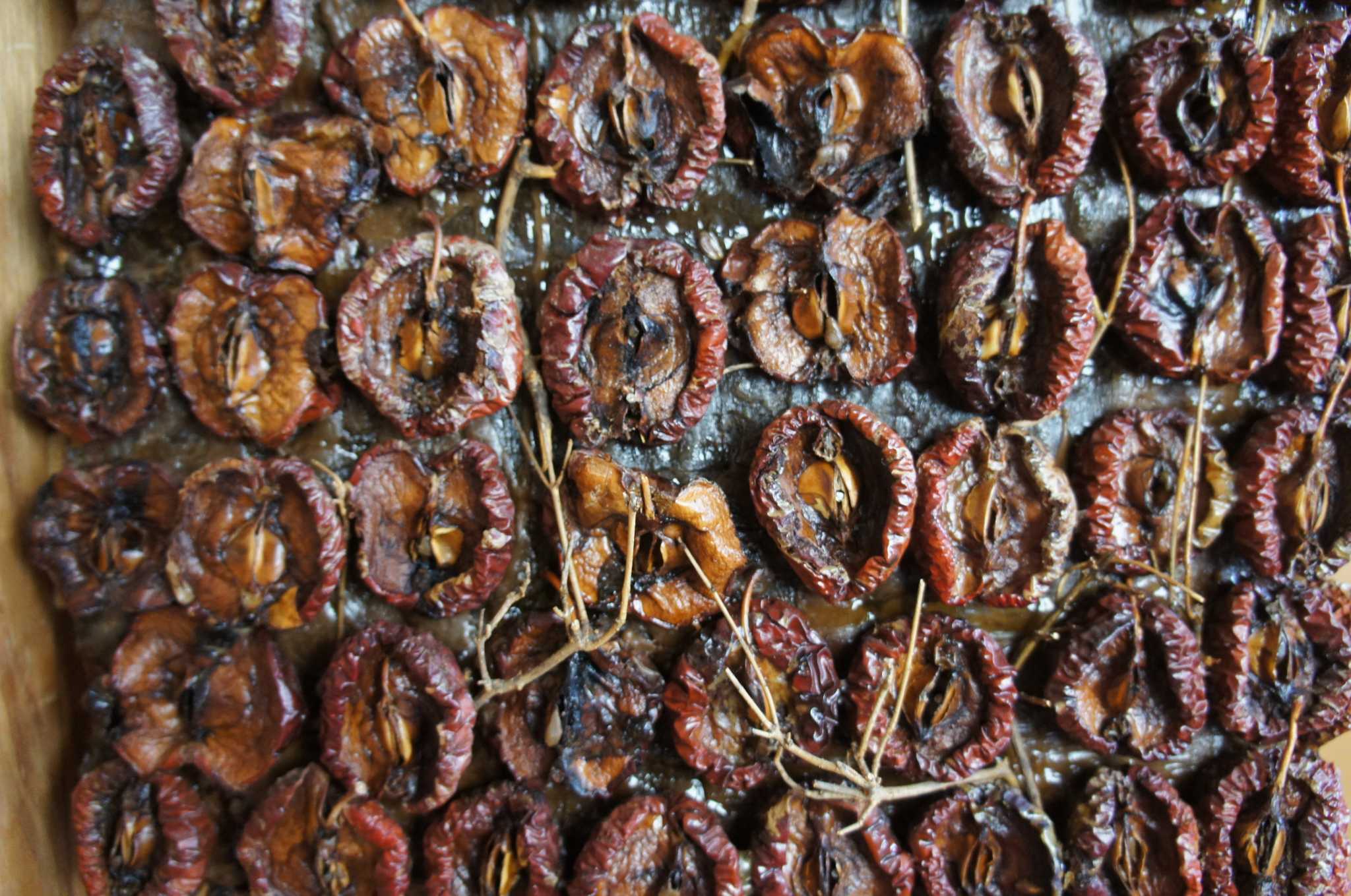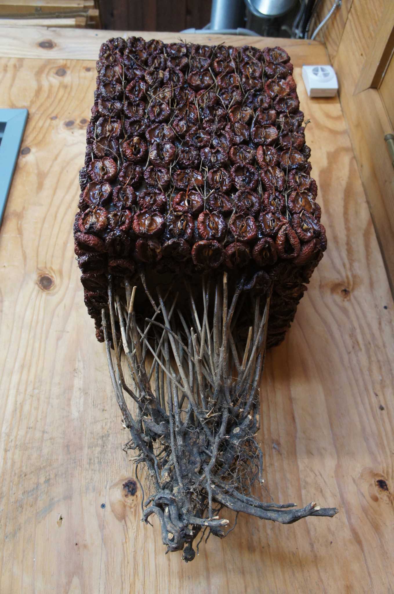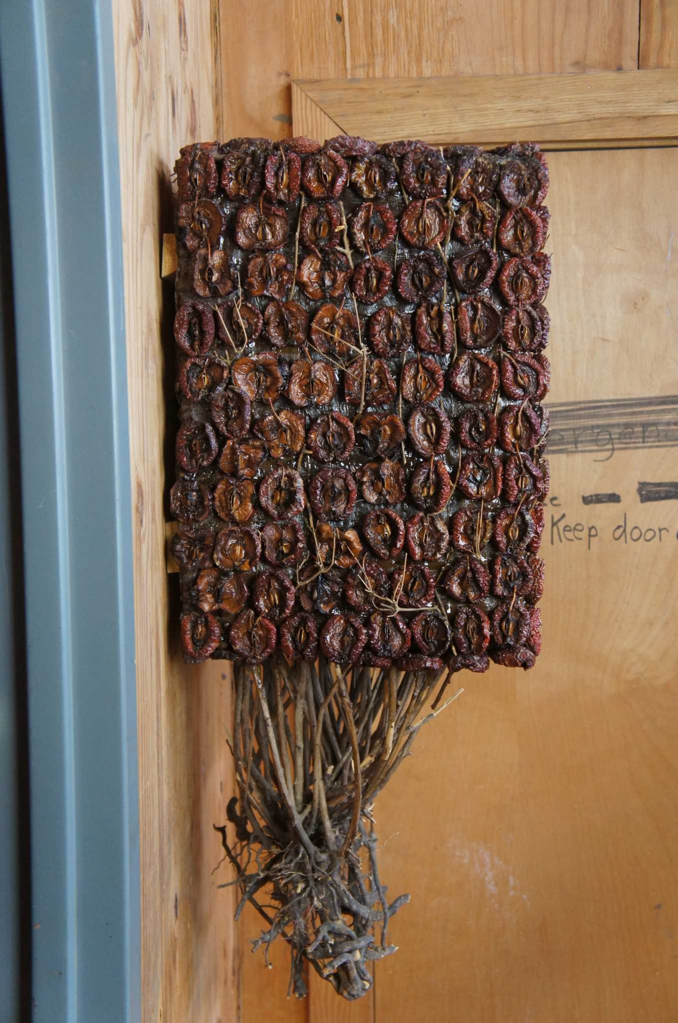 1993 contemporary art sculpture featuring a cube shape covered in sun dried tomatoes, with a twig or tree root system coming off the underside. Mounts to wall via cleat.