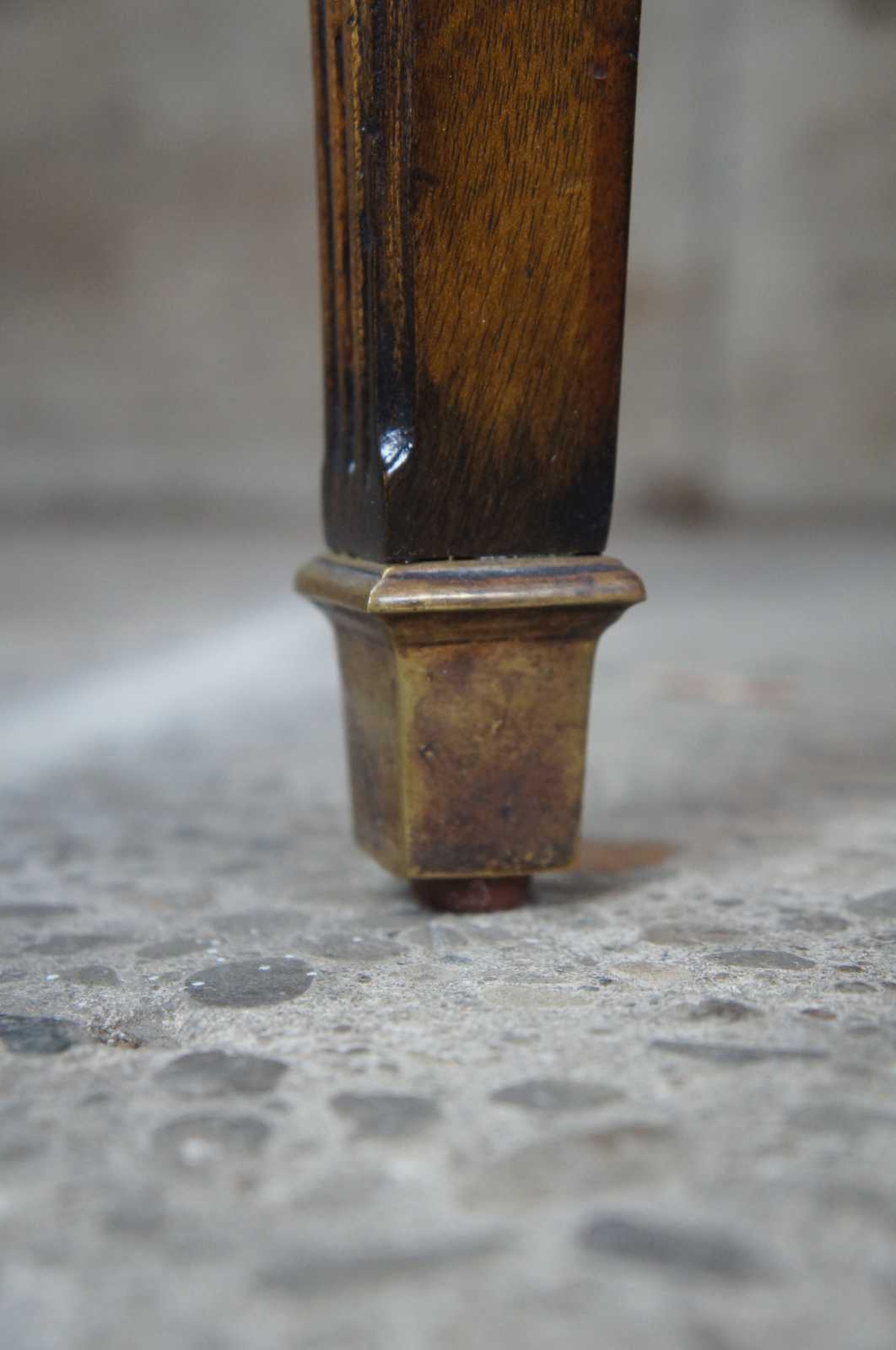 Traditional inspired drum table by Henredon. The Burnet side table is from the Acquisitions Collection. Flamed mahogany with 3 drawers, tapered and fluted legs over brass capped feet. Product number 3030-41-669