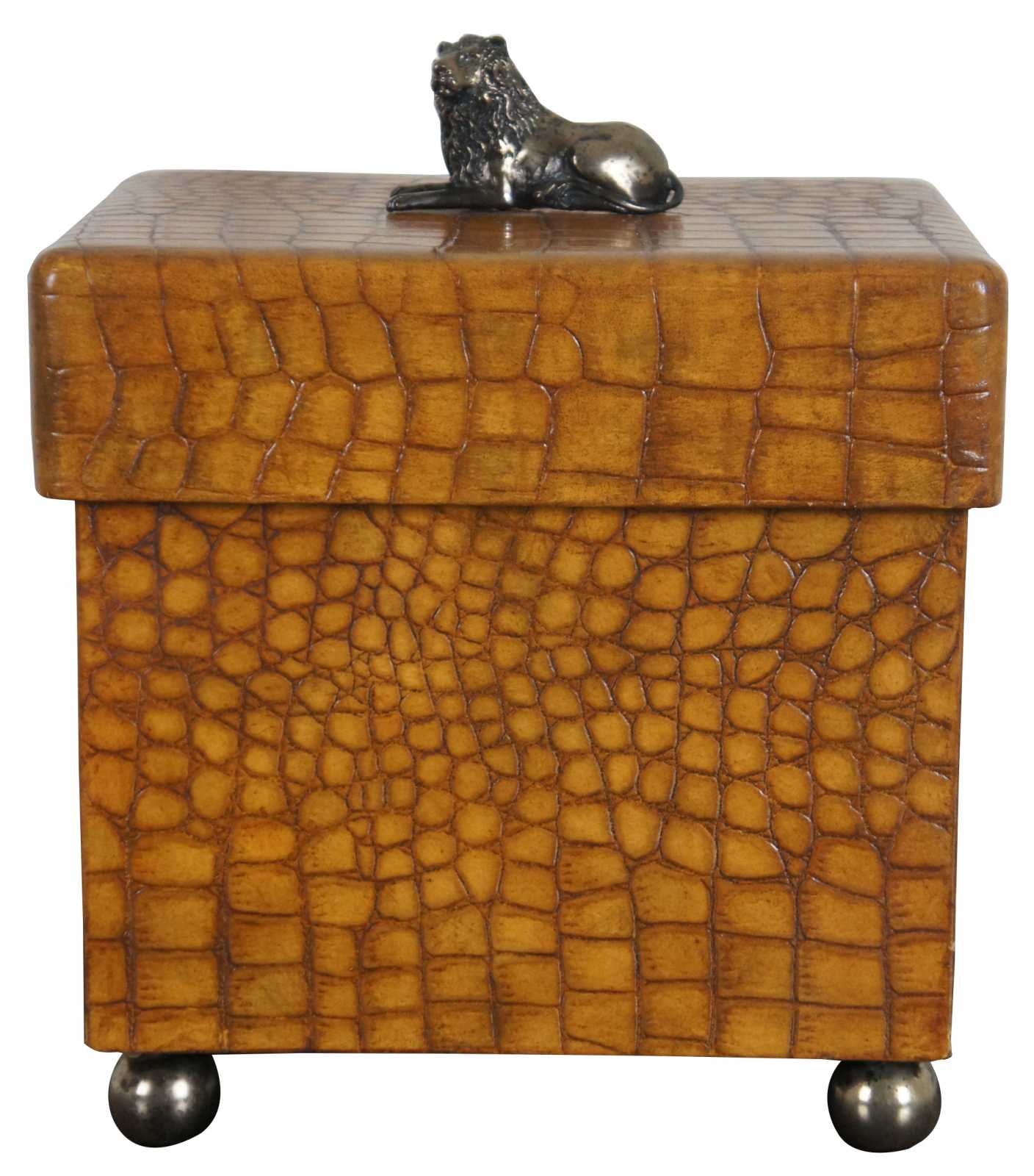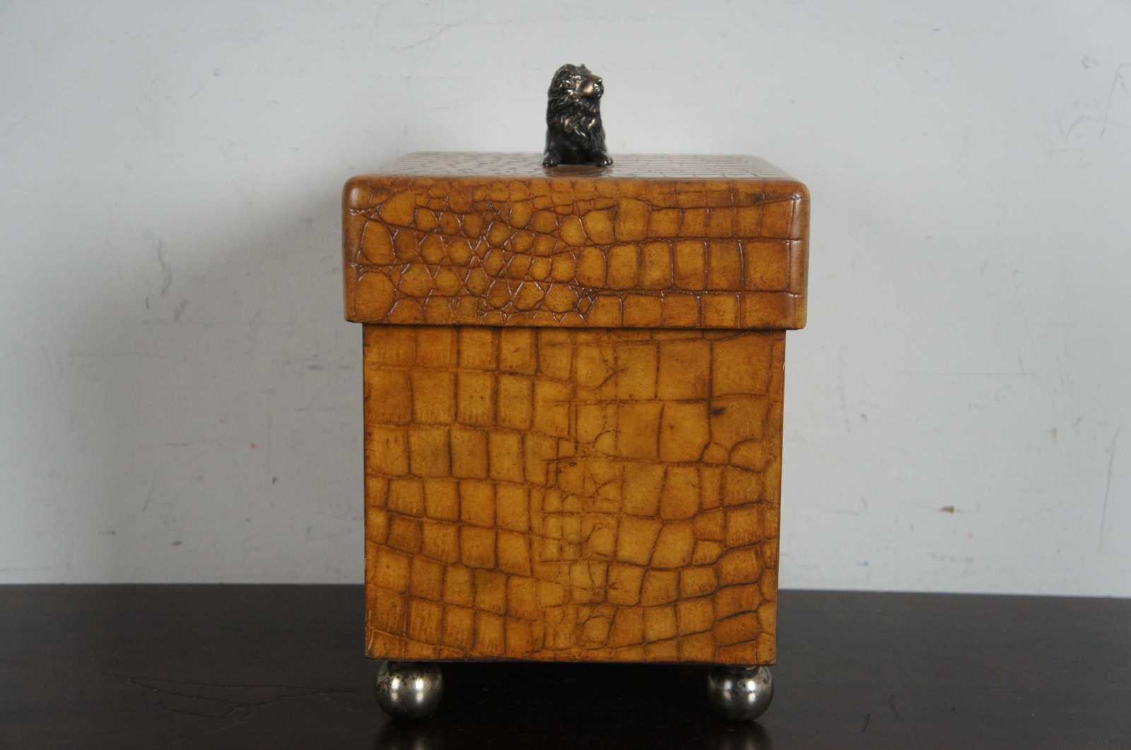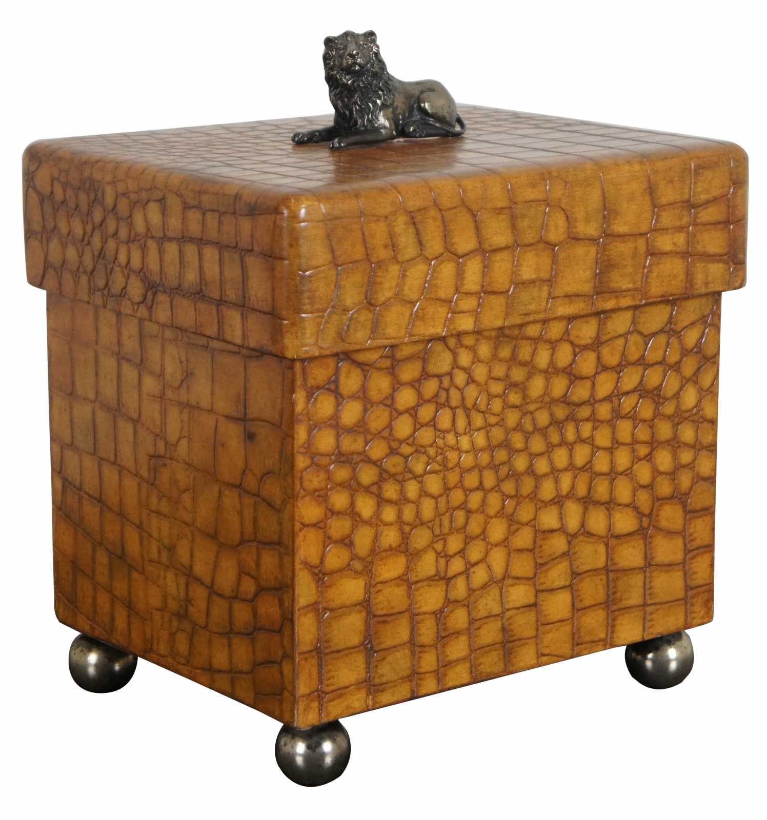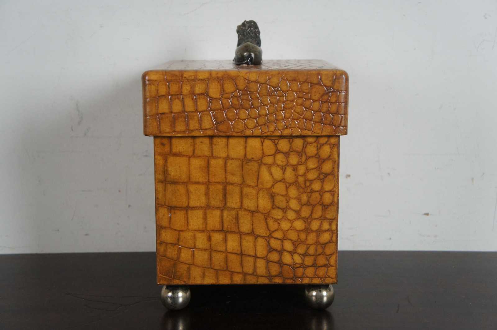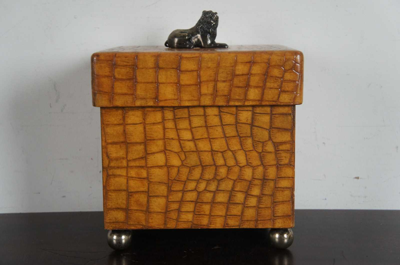 A handsome Maitland Smith wooden box on ball feet, the lid having a reclining lion as the finial. The box is in a faux alligator texture.