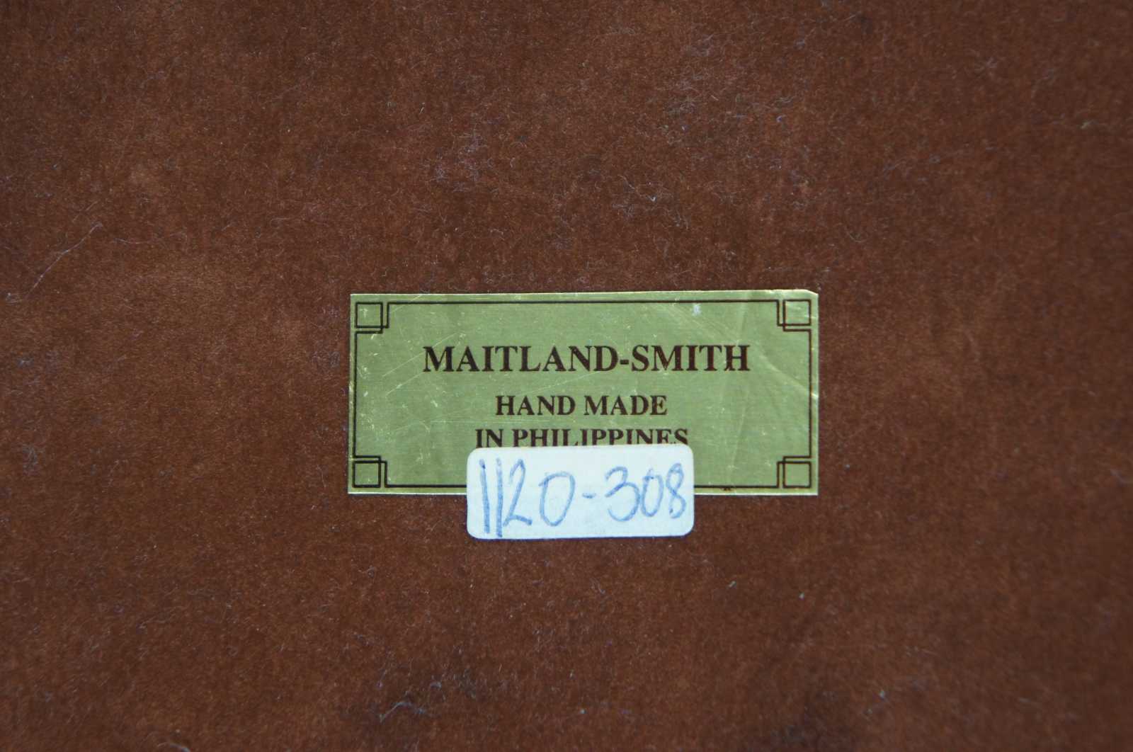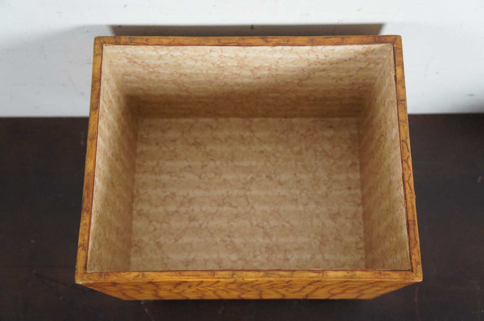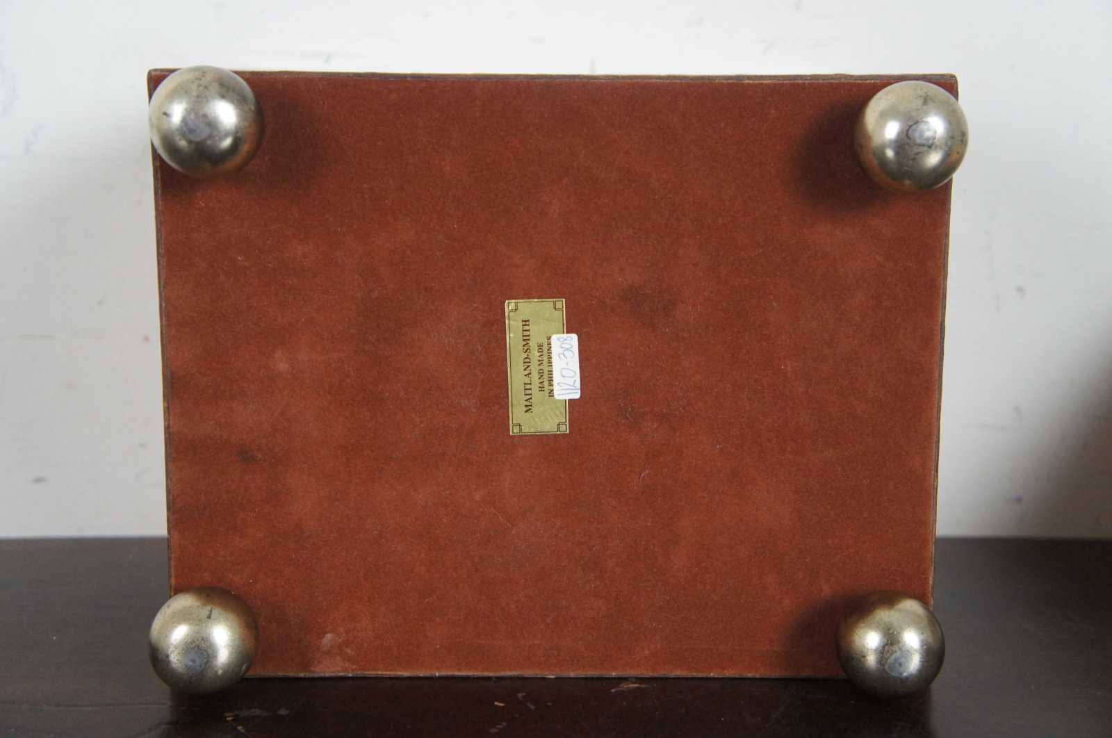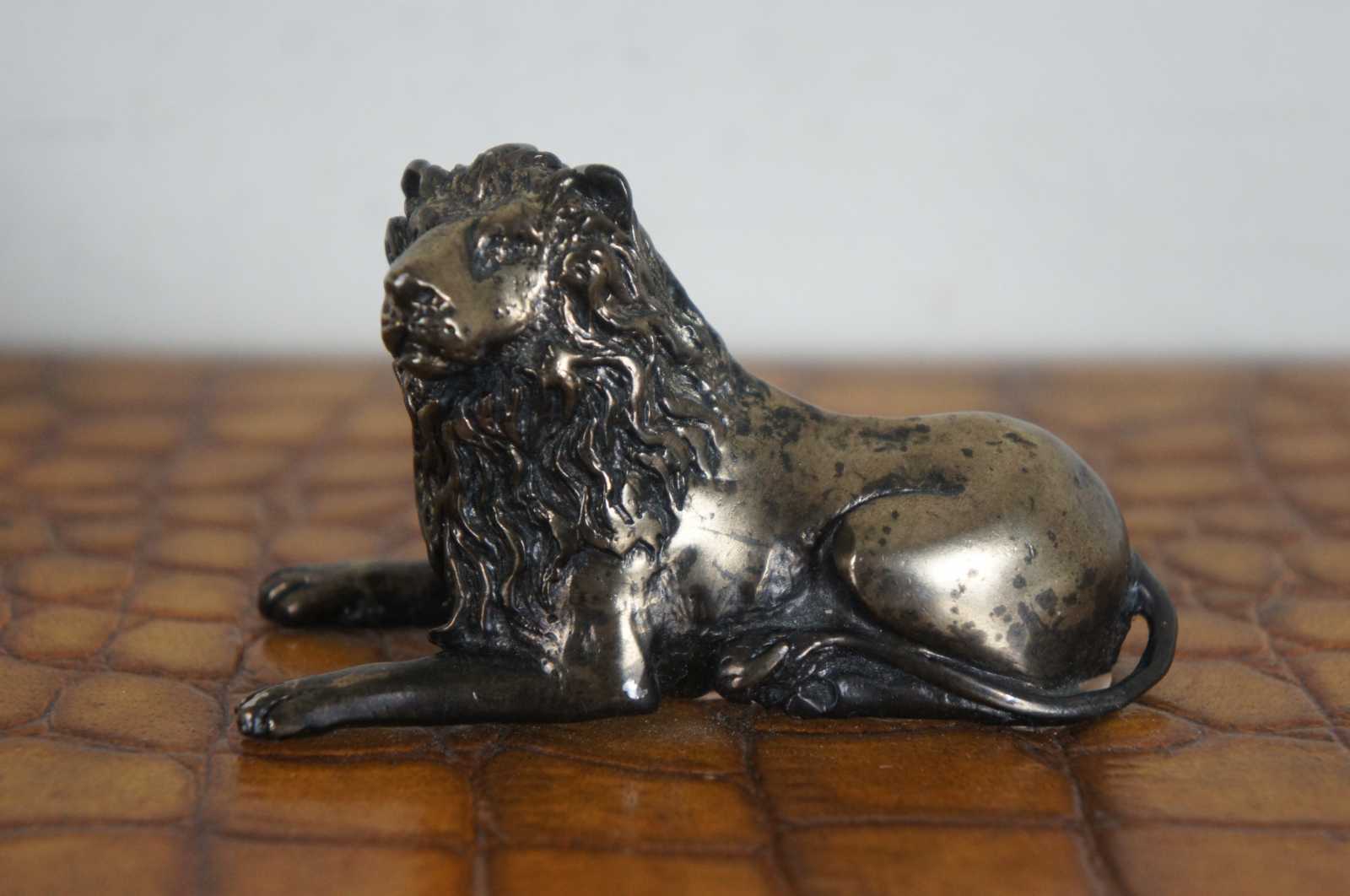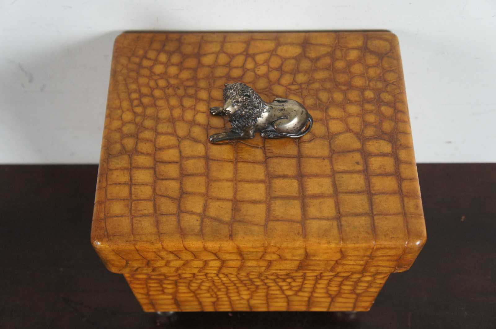 A handsome Maitland Smith wooden box on ball feet, the lid having a reclining lion as the finial. The box is in a faux alligator texture.