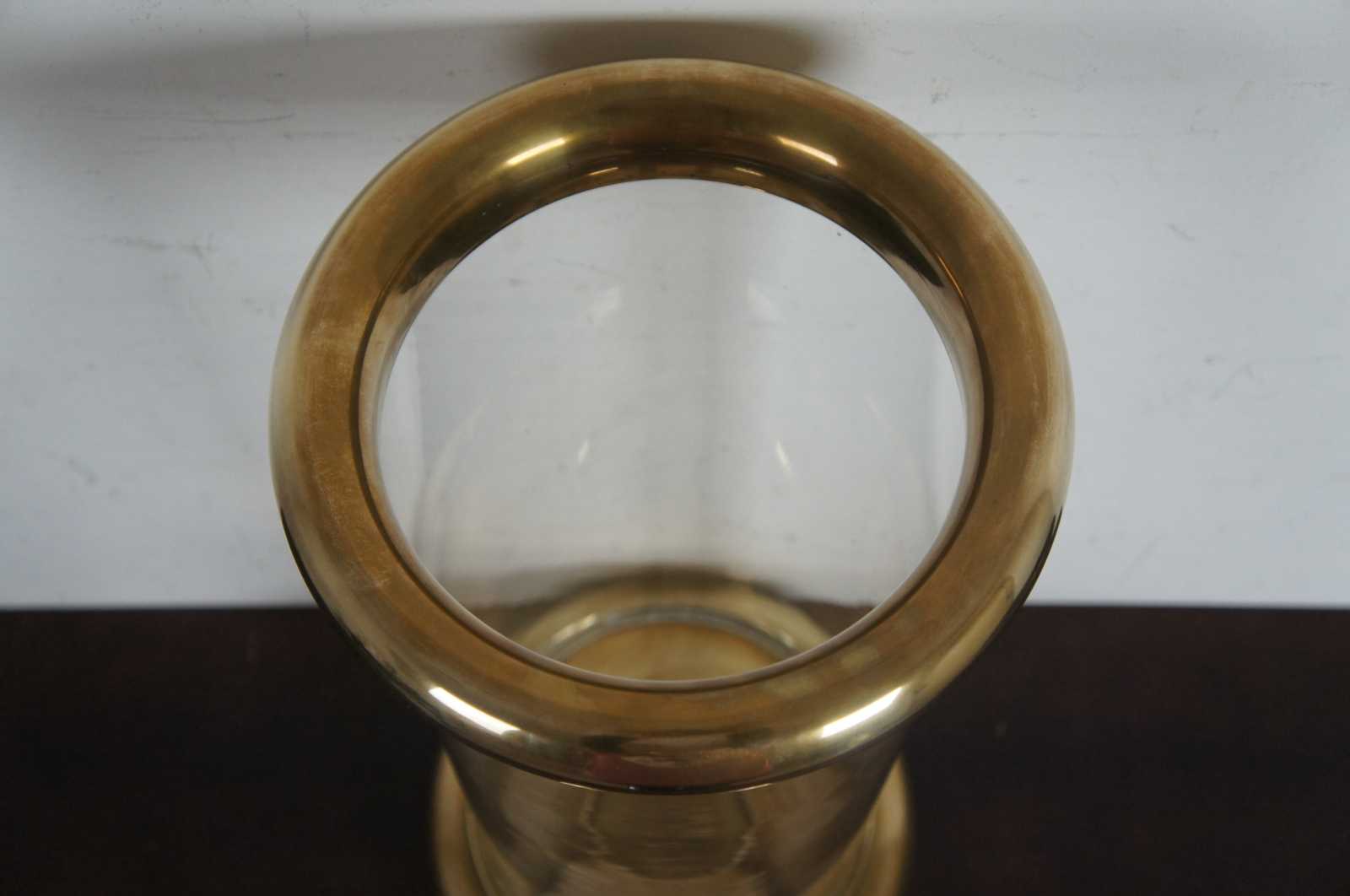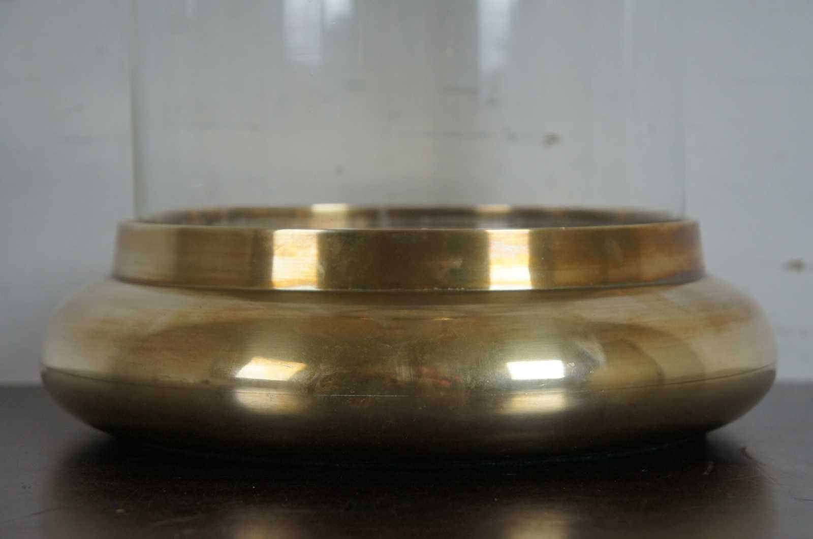 Chapman "Bun" hurricane lantern or candle holder. Features heavy brass base and top with hand blown 10" glass hurricane between. Made in 1980, retired.