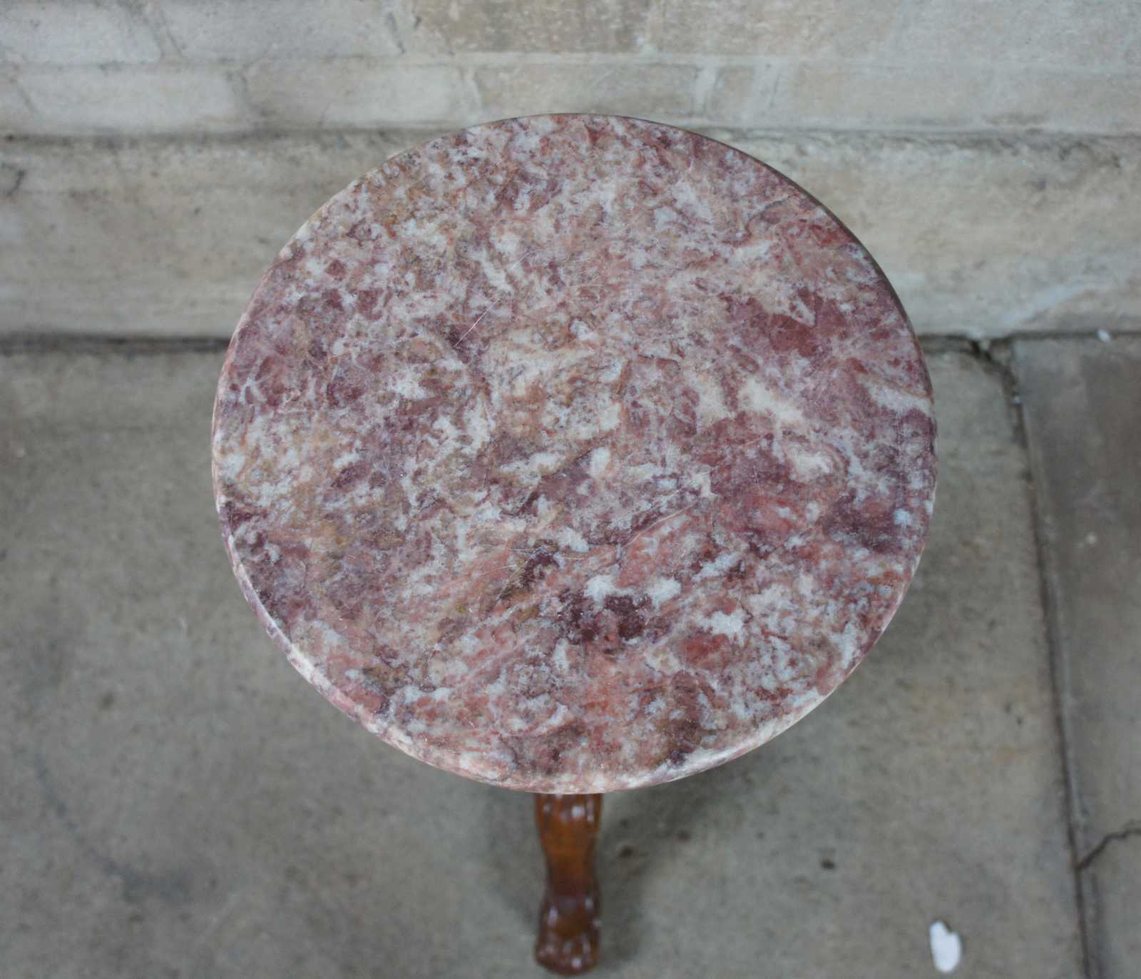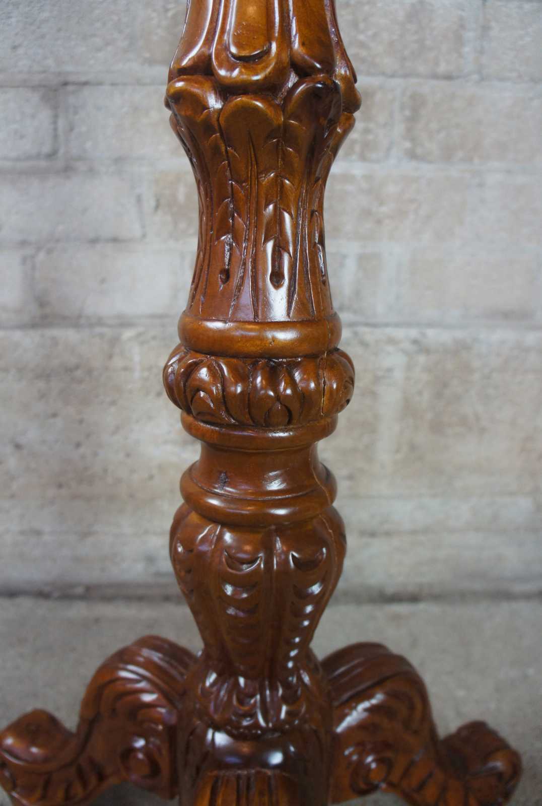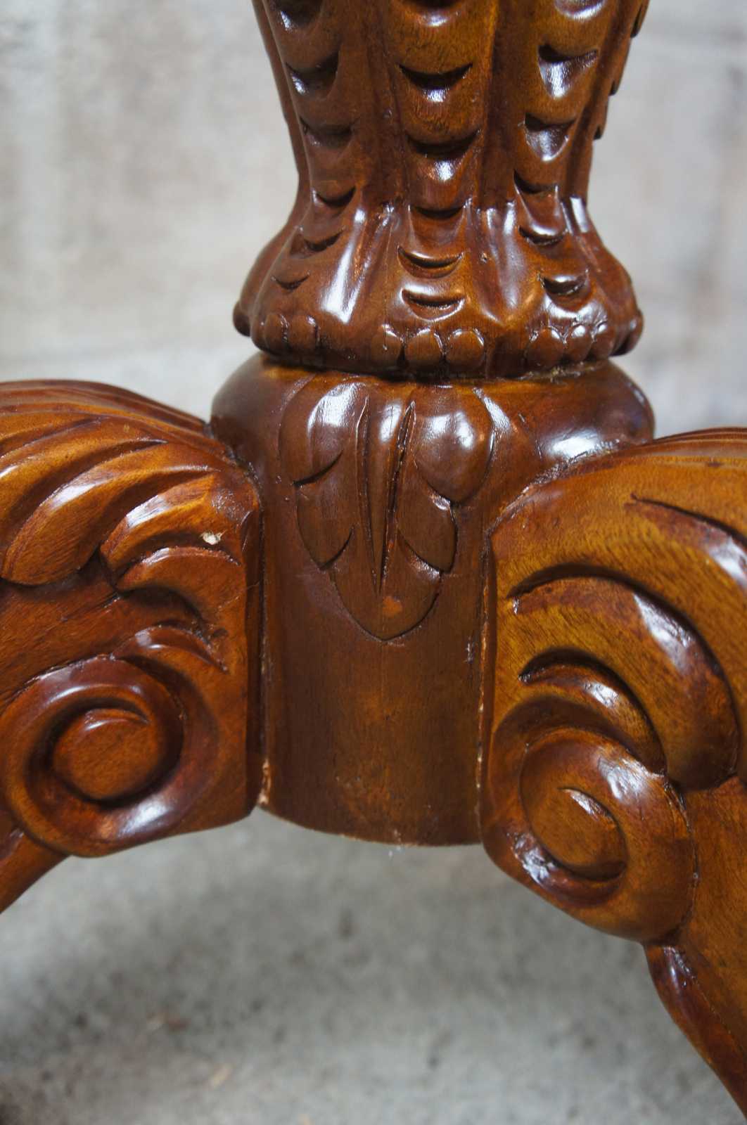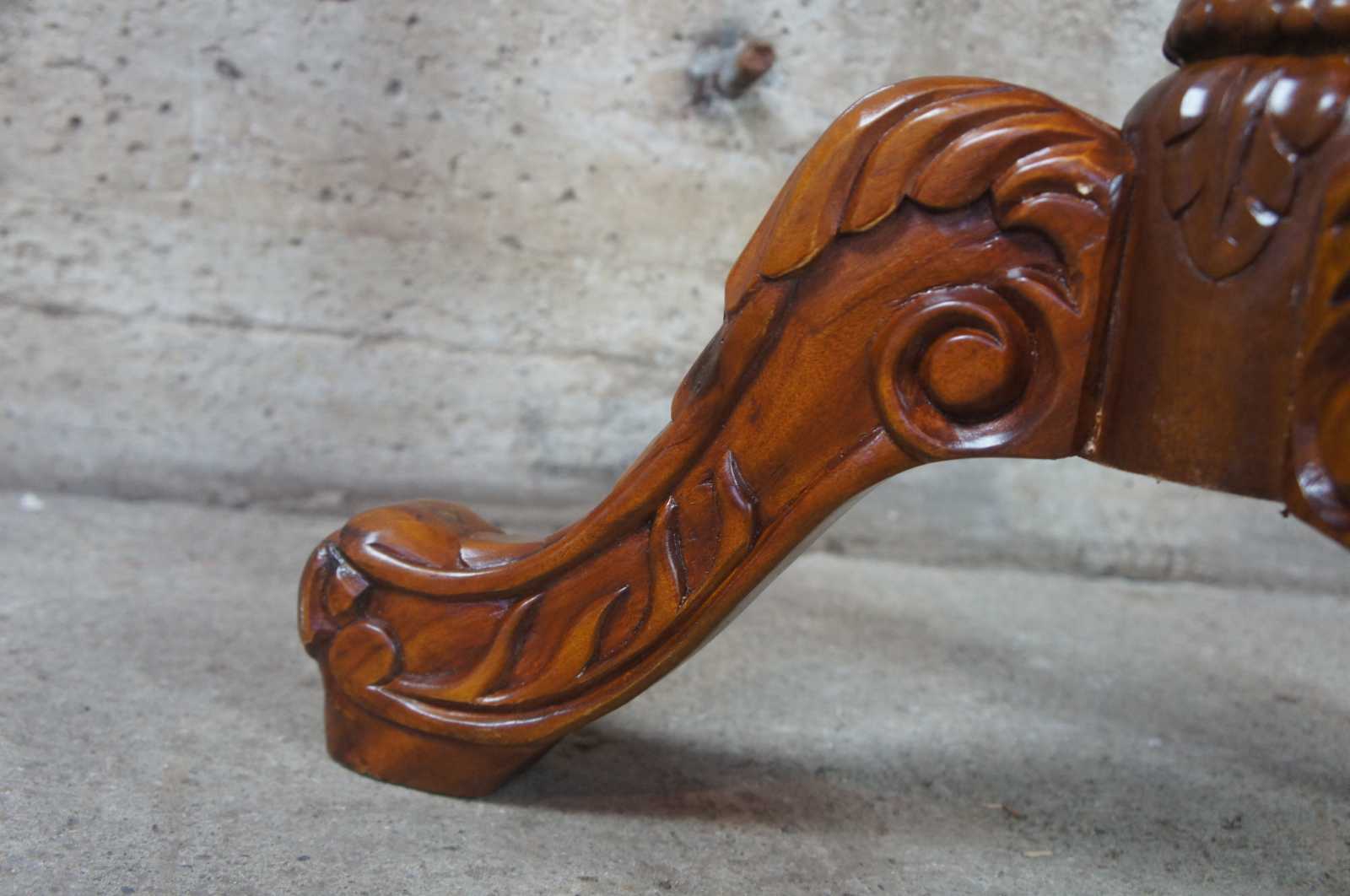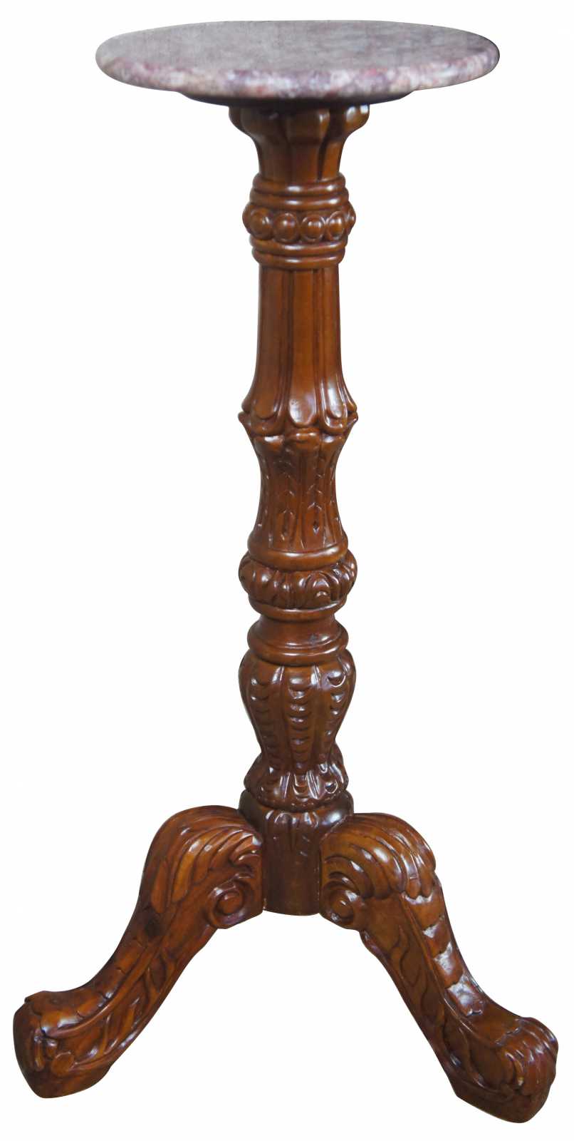 Victorian inspired carved mahogany pedestal or plant stand with tripod shaped base. Features intricate carved details and a pink / maroon round marble top.