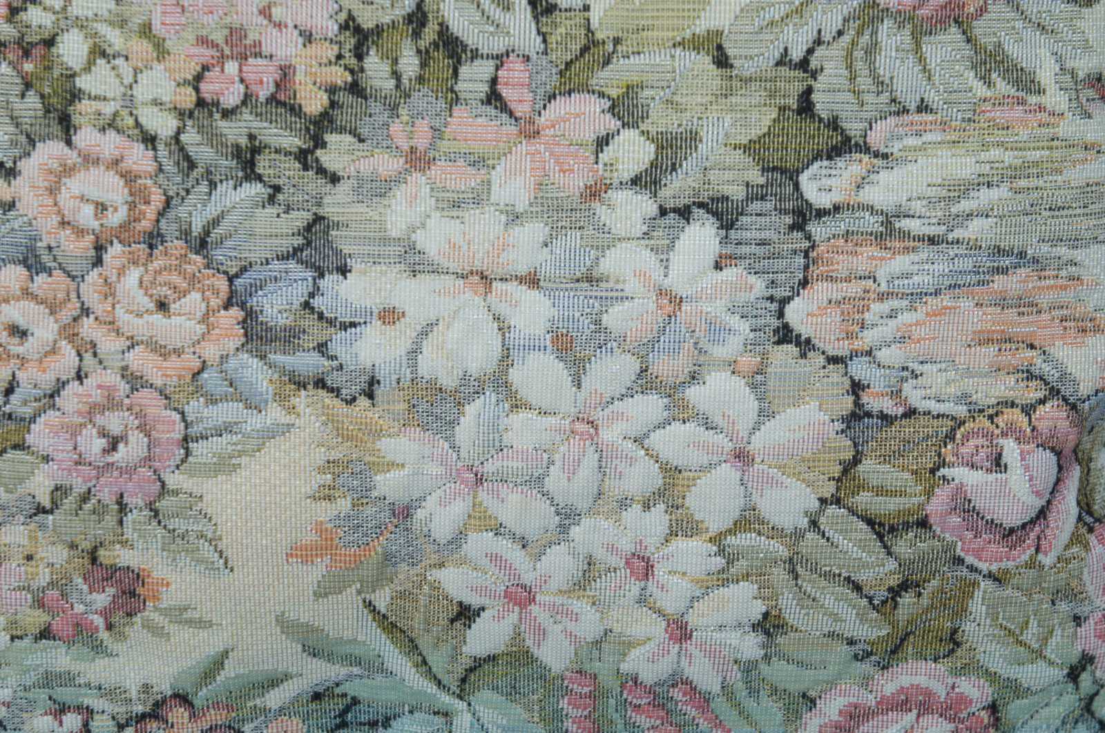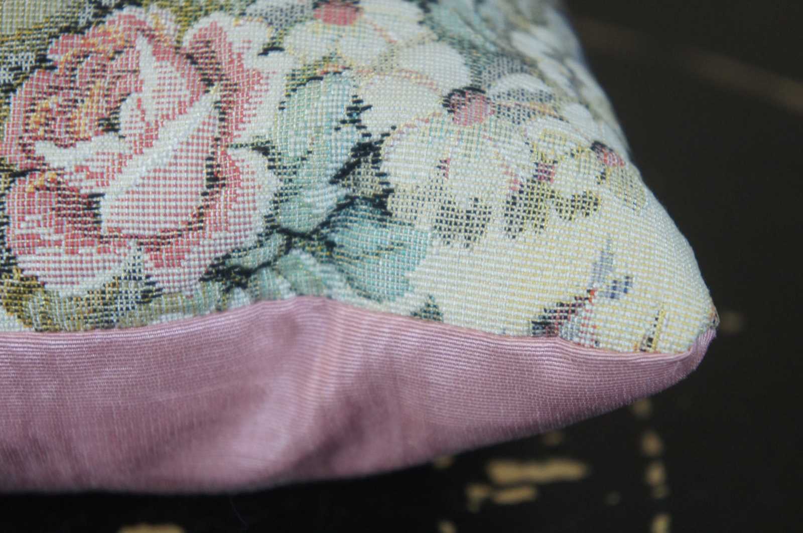 Embroidered needlepoint pillow with floral ubusson motif and pink silk backing.