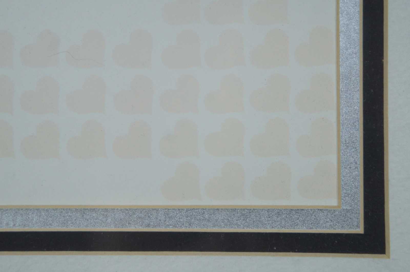 Erte art print, titled "Fringe Gown", featuring a women in art deco garb against the backdrop of a black heart and repeating heart motif boarder.