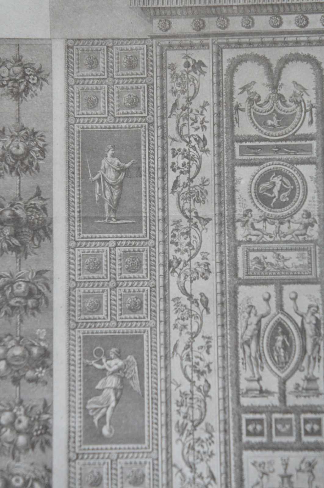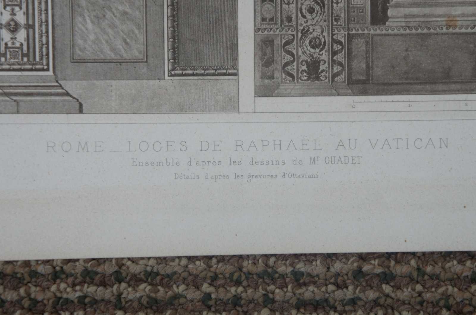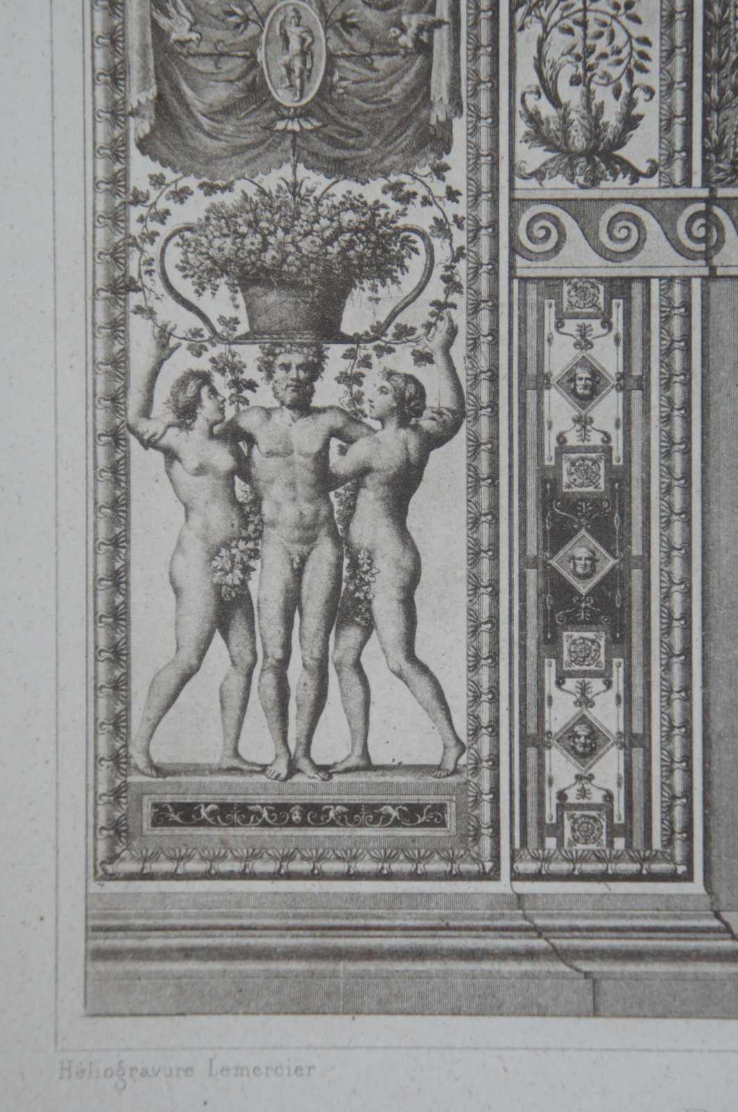 A set according to the drawings of Guadet. Detailed after the engravings of Ottaviani. Reads "Rome Loges de Raphael au Vatican Engraving. Ensemble d'apres les dessins de mt Guadet. Details d'apres les gravures d'ottaviani. Heliogravure Lemercier. Moyen Age Et Renaissance". Features floral motifs, angels, unicorns / narwol figures, nudes, cherubs, other animals, goddesses / figures, architectural designs.