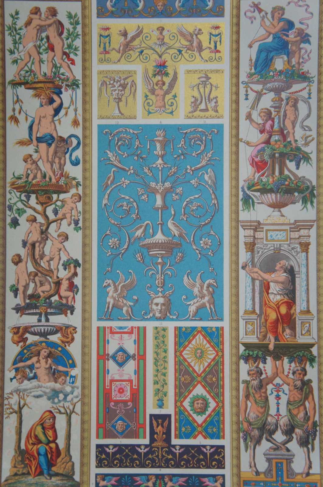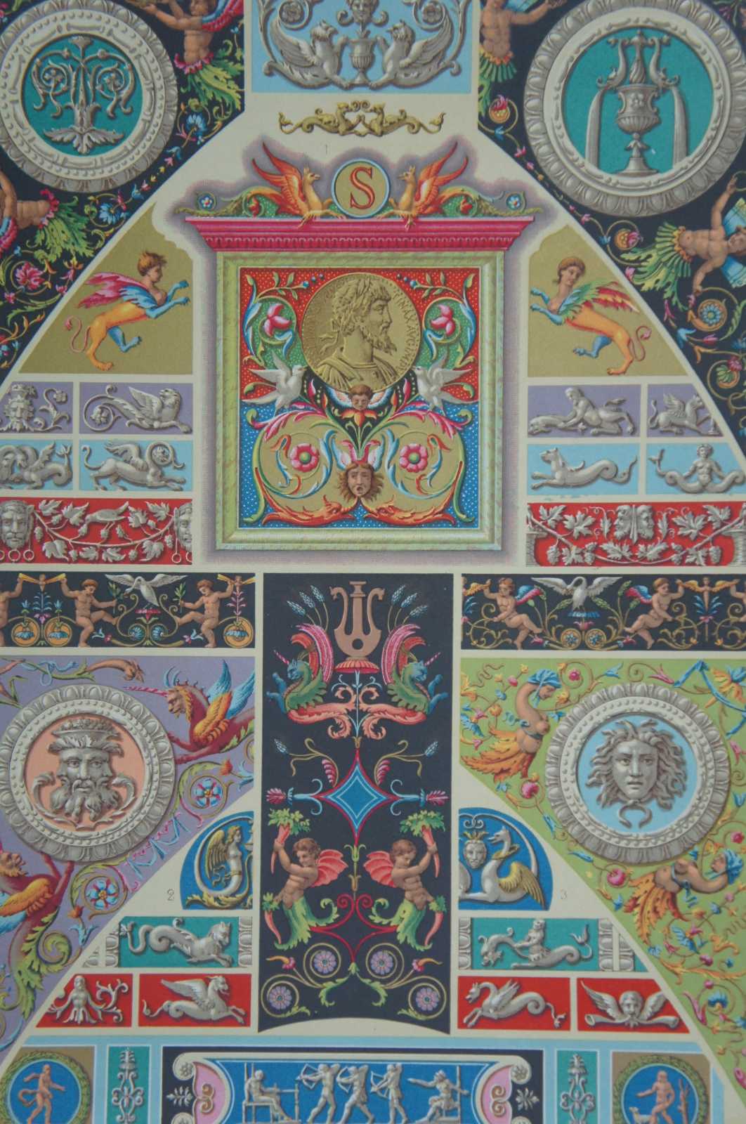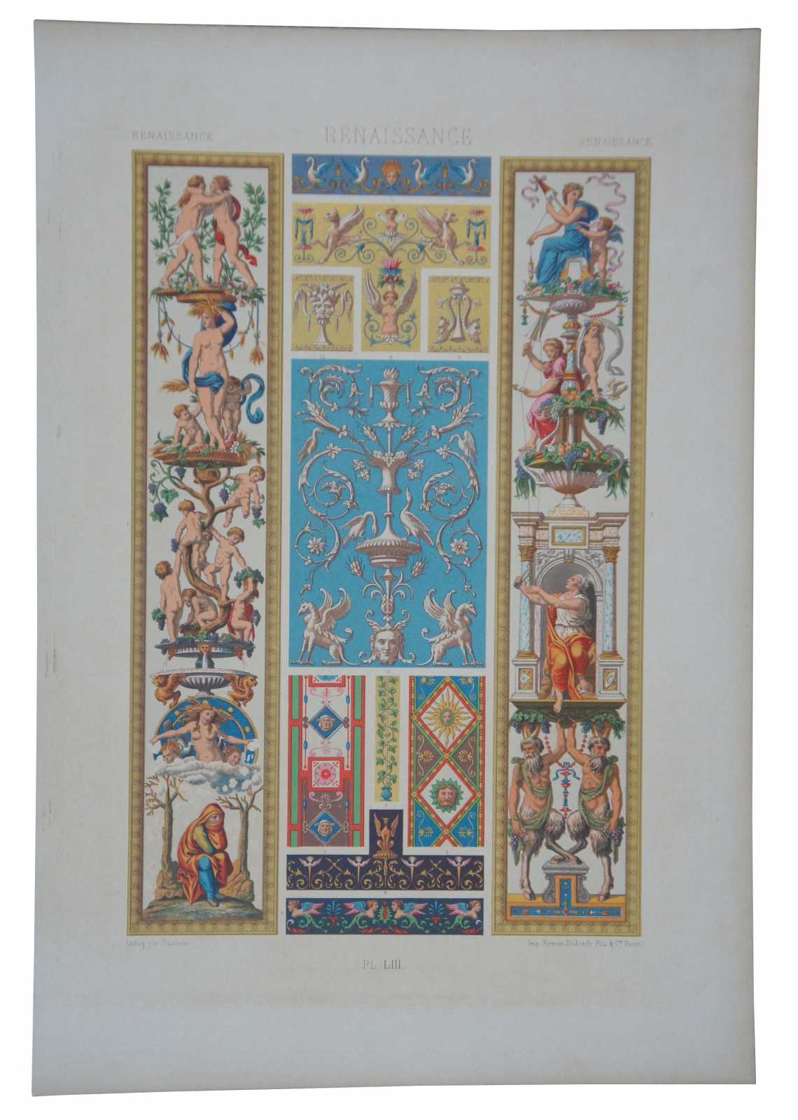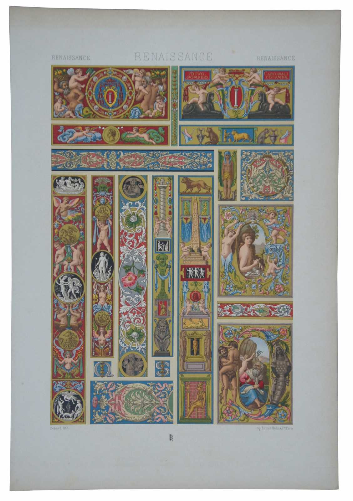 3 Hand colored polychrome chromolithgraph (lithograph) architectural Renaissance prints. Imp by Firmin Didot & Co, Paris. Features figural nudes, gardens, gods, cherubs, angels, griffins, griphons, gryphons, swans, stags, dragons, ions, serpents, cherubs, nymphs, figures, animal heads, bugs, north wind face, traditional Greek / Grecian styling, egyptian motifs, architectural columns, acanthus leaves, ornate geometric details, cornucopias, trophy urns , ect.. Text reads: Divo Pompeio Cardinali Columnae, Lithog par Painleve, Bernard, Lith, Lith par Durn, Lithograph,