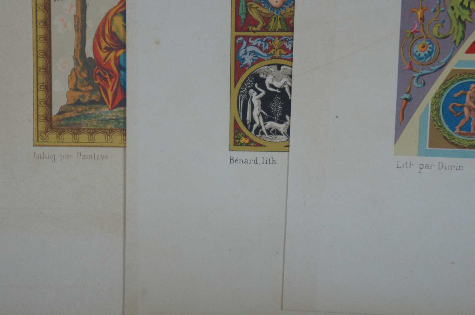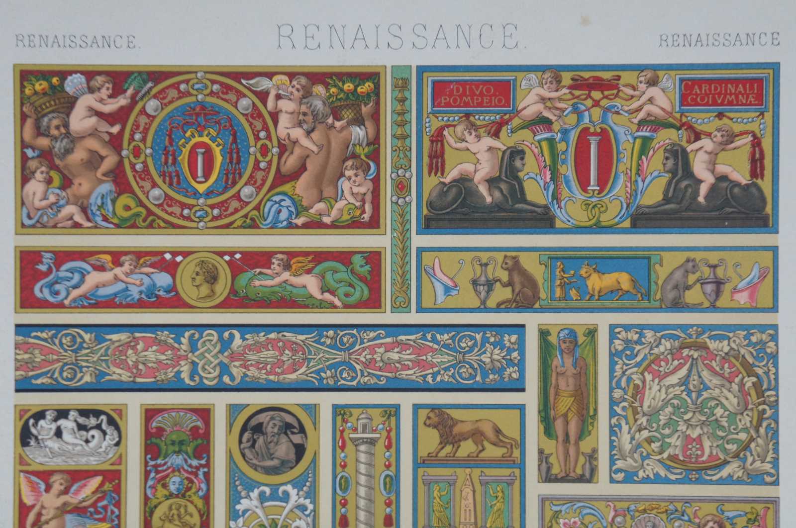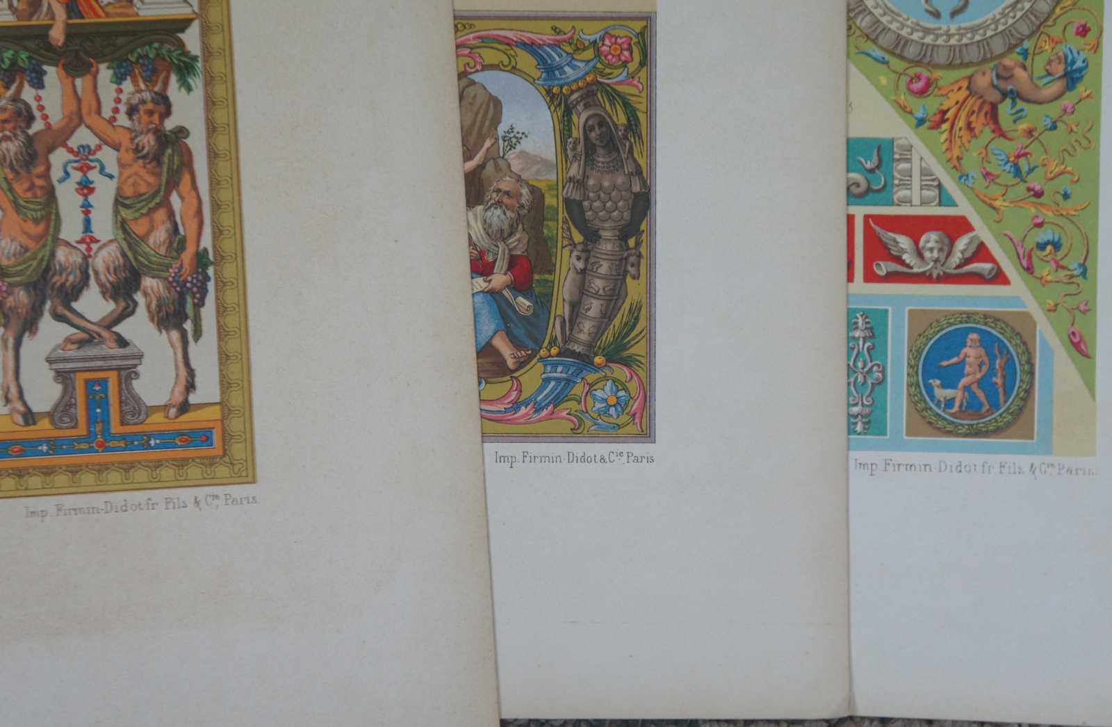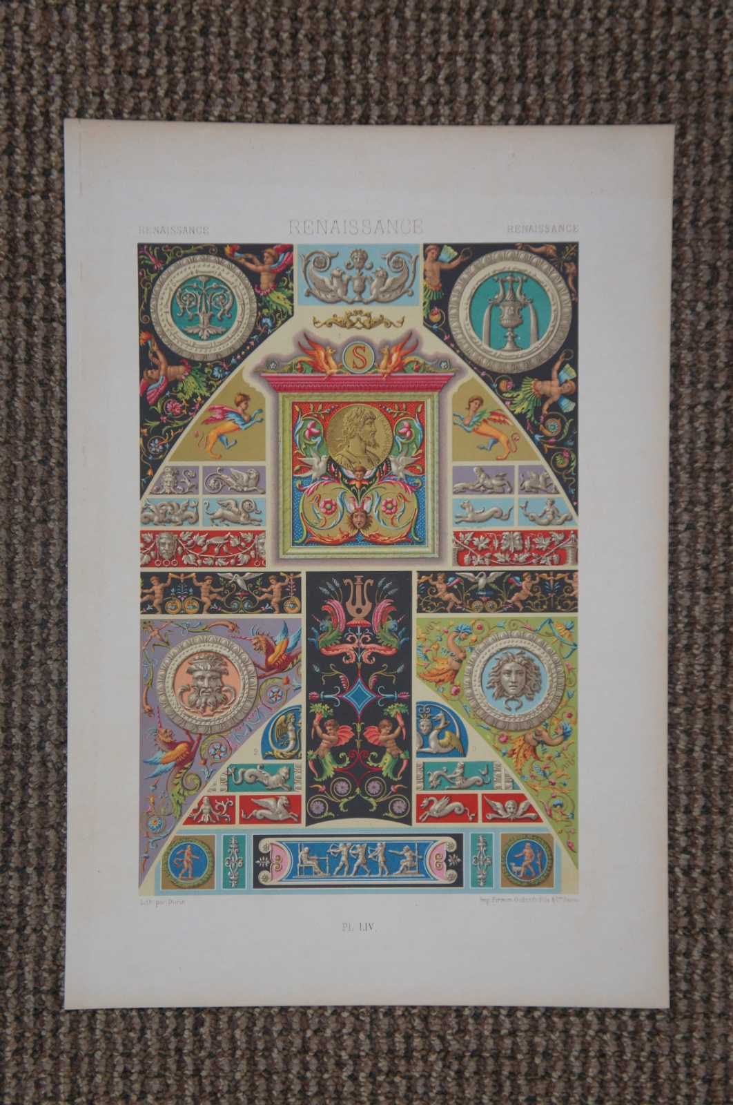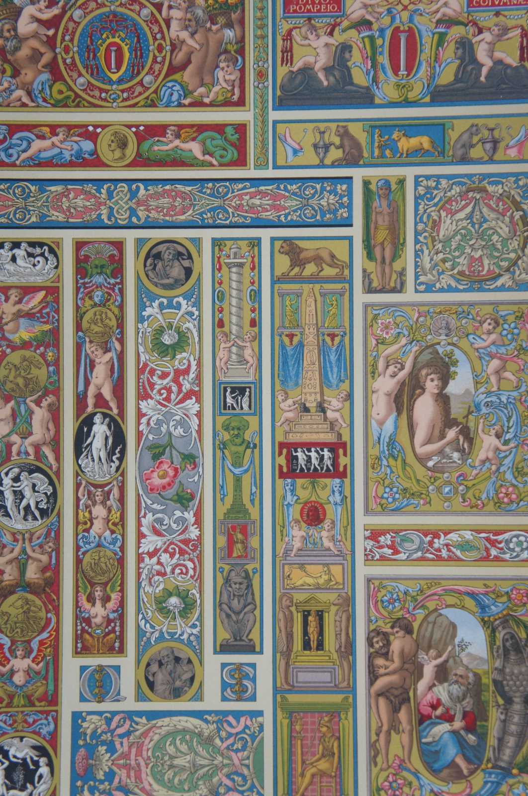 3 Hand colored polychrome chromolithgraph (lithograph) architectural Renaissance prints. Imp by Firmin Didot & Co, Paris. Features figural nudes, gardens, gods, cherubs, angels, griffins, griphons, gryphons, swans, stags, dragons, ions, serpents, cherubs, nymphs, figures, animal heads, bugs, north wind face, traditional Greek / Grecian styling, egyptian motifs, architectural columns, acanthus leaves, ornate geometric details, cornucopias, trophy urns , ect.. Text reads: Divo Pompeio Cardinali Columnae, Lithog par Painleve, Bernard, Lith, Lith par Durn, Lithograph,